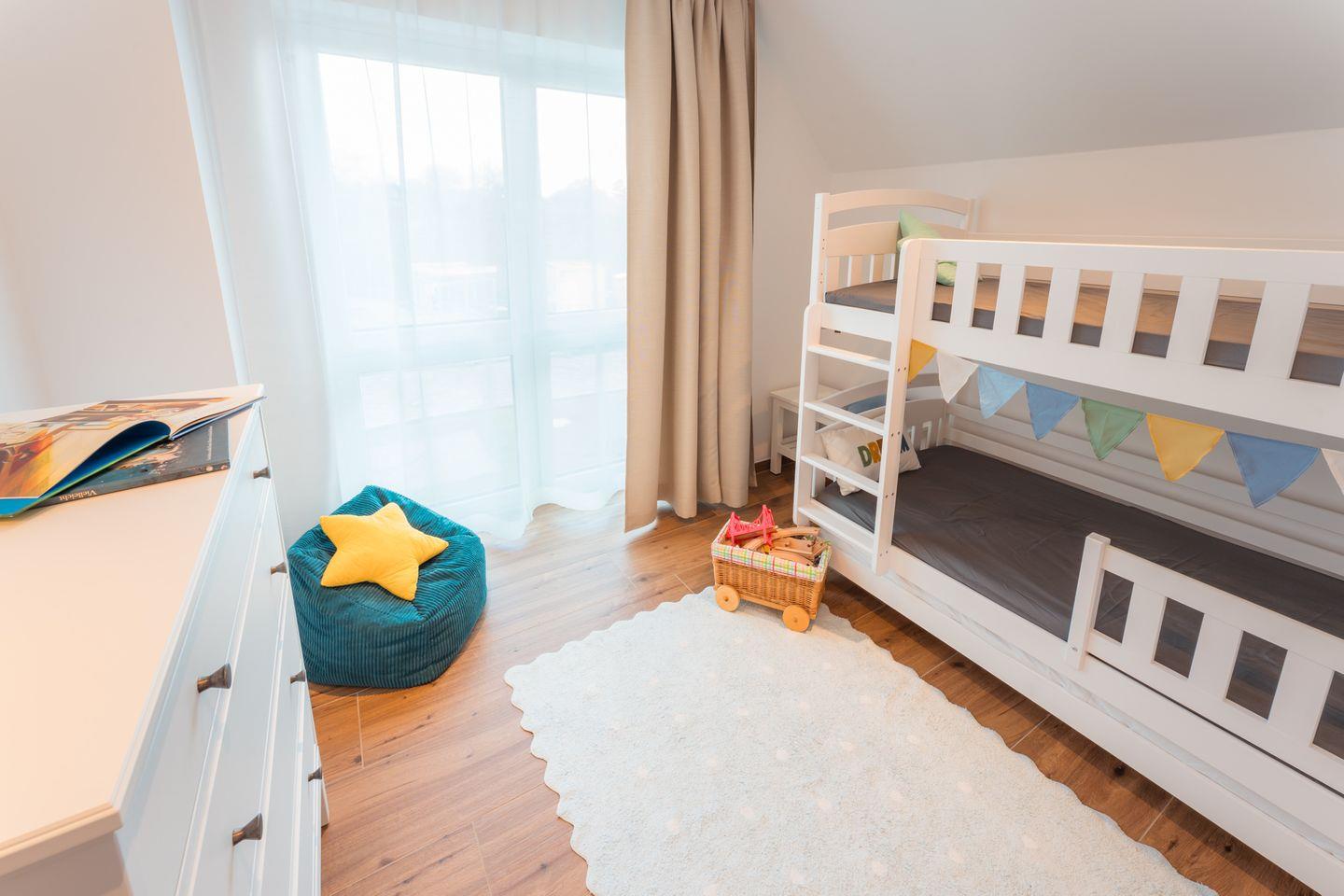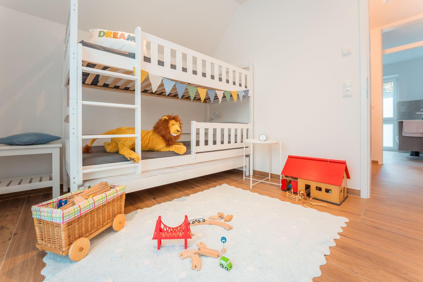 Schlafzimmer 3: Stockbett (Maße: 90 x 200 cm), Kleiderschrank, Verdunklungsmöglichkeit durch Vorhang, verschiedene Spiele und Spielzeug, Kinderbücher