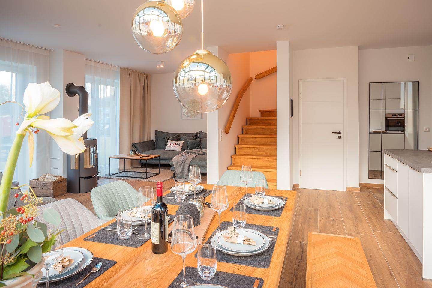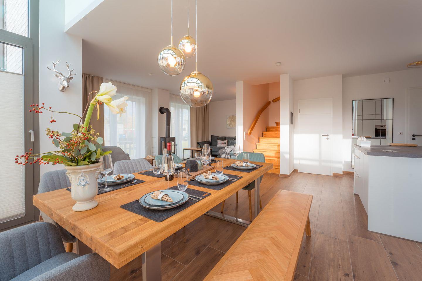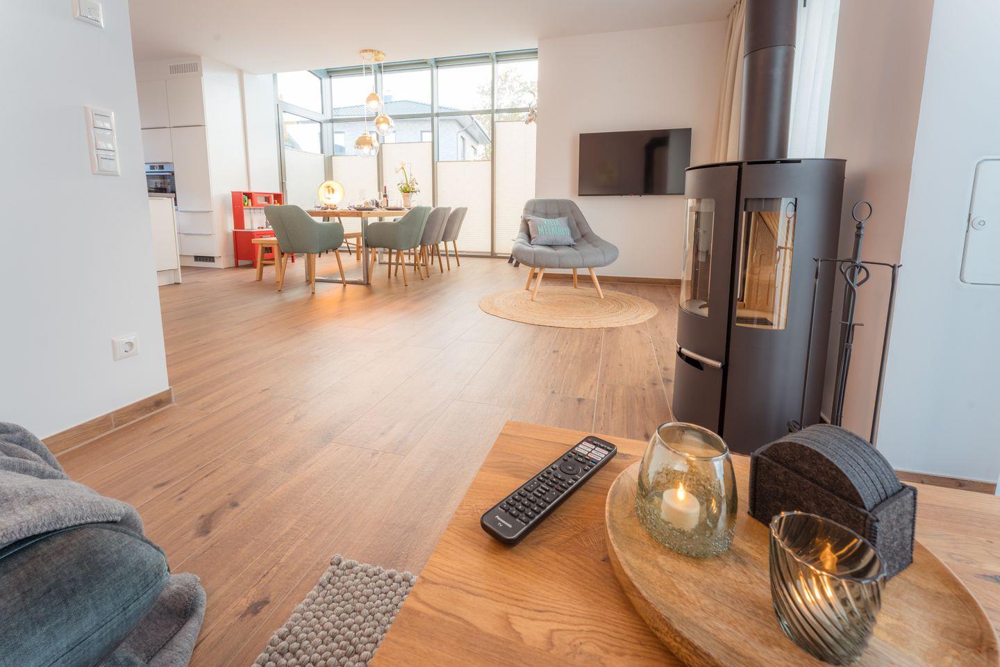 Wohn-Esszimmer: Sofalandschaft, Couchtisch, Leselampe, Flachbildfernseher (Smart-TV), Empfang deutschsprachiger TV-Programme (SAT-Anlage),Kamin, Spielküche