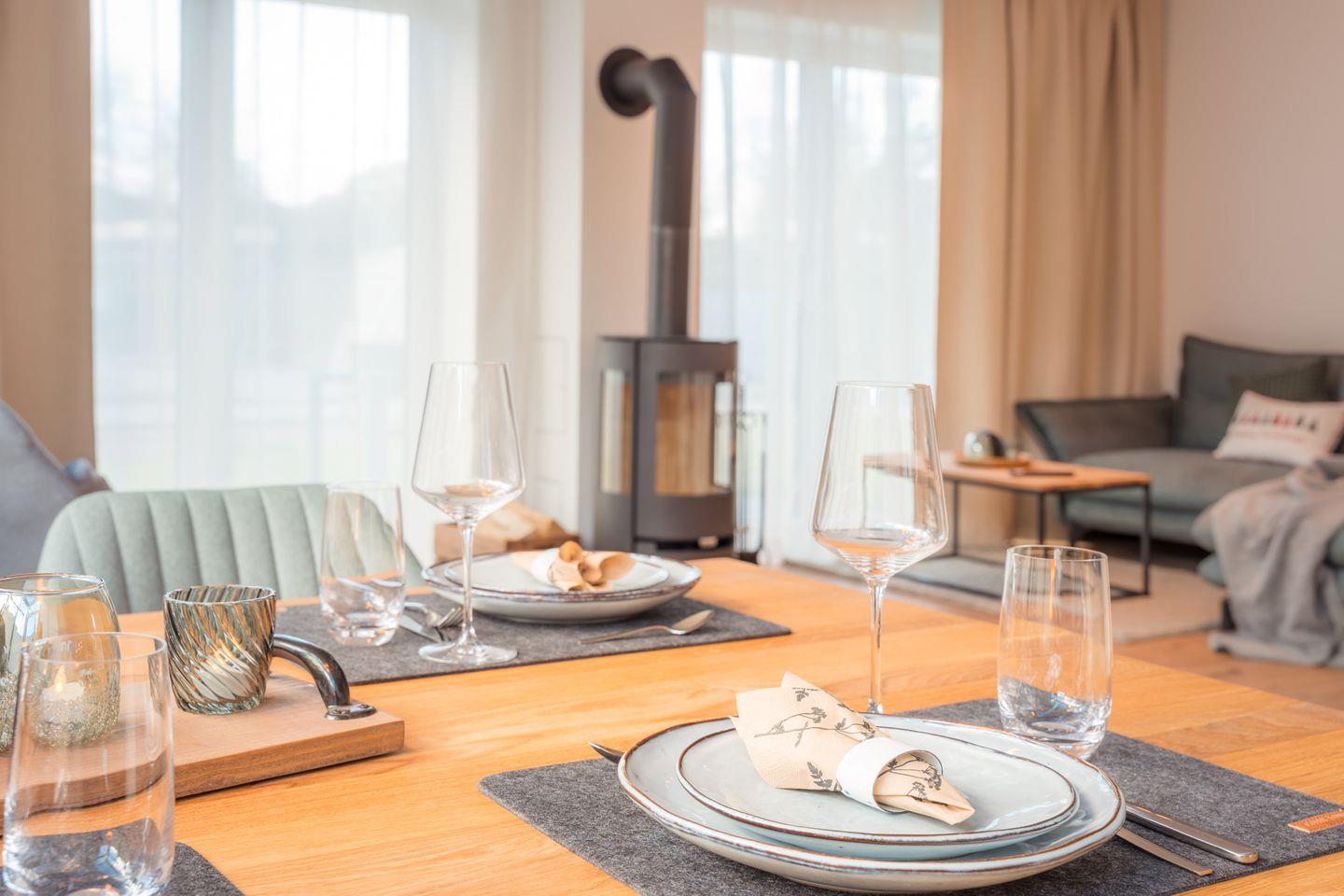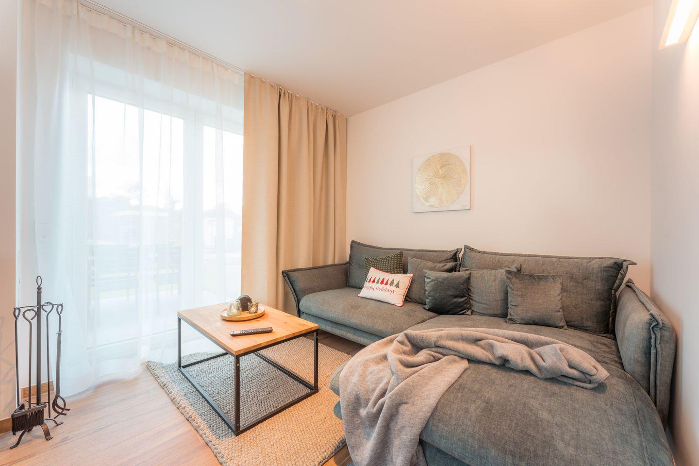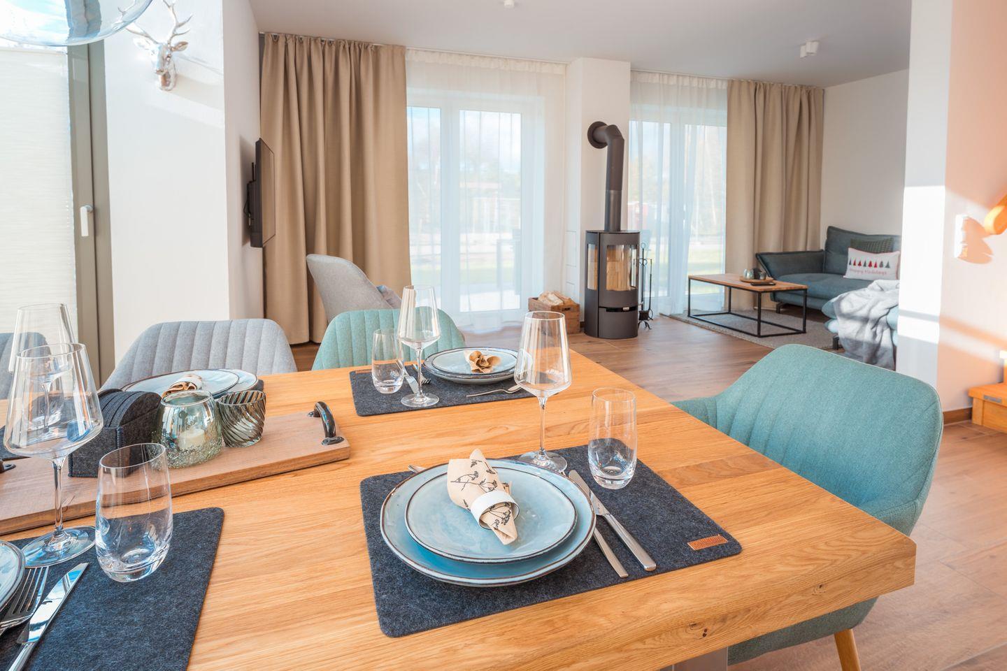 Wohn-Esszimmer: Sofalandschaft, Couchtisch, Leselampe, Flachbildfernseher (Smart-TV), Empfang deutschsprachiger TV-Programme (SAT-Anlage),Kamin, Spielküche