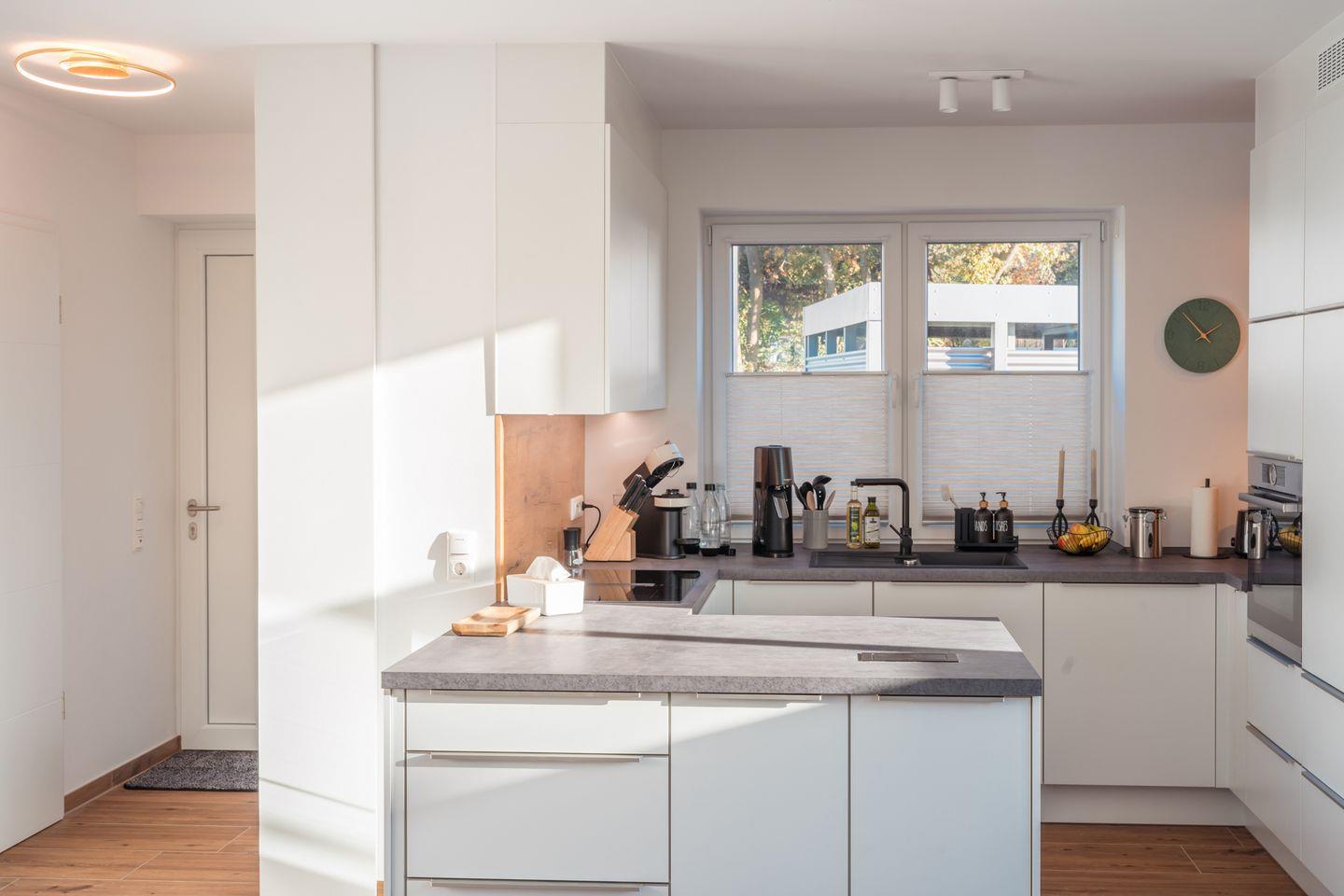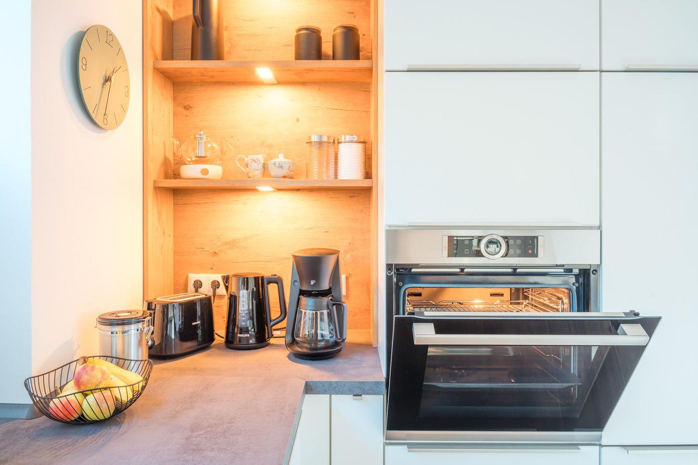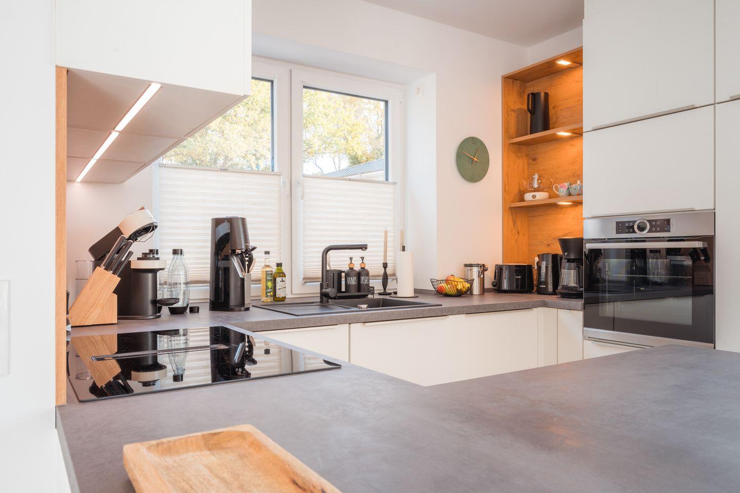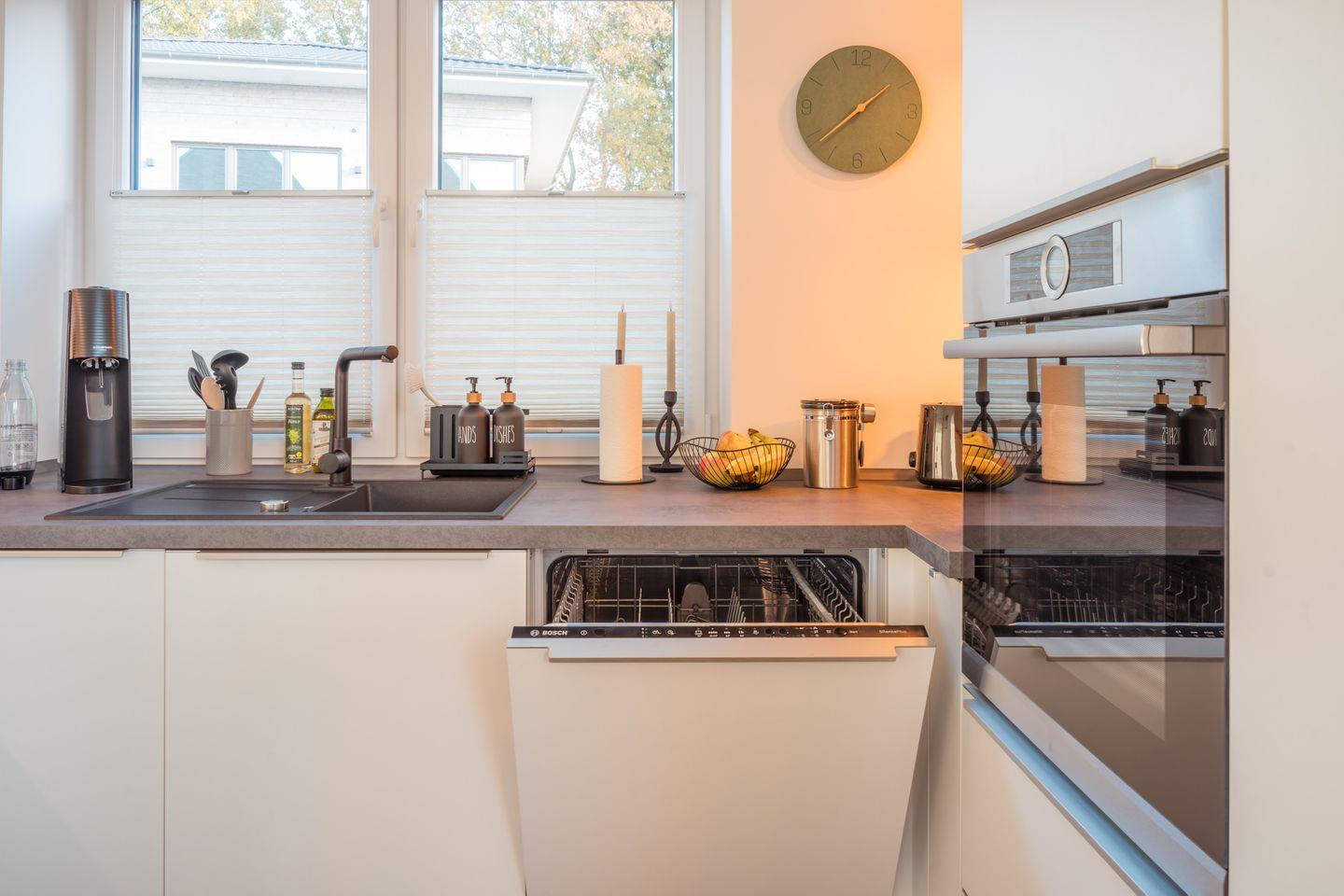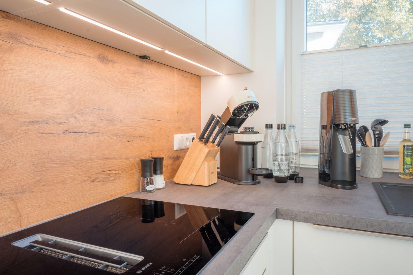 Küche und Haushalt: Einbauküche, Kühlschrank mit Gefrierfach, 4-Zonen Cerankochfeld mit integriertem Dunstabzug, Backofen, Geschirrspüler, Kaffeefiltermaschine, Kaffeekapselmaschine, Toaster, Wasserkocher, Sodastream, hochwertiges Geschirr und Besteck, diverse Küchenutensilien