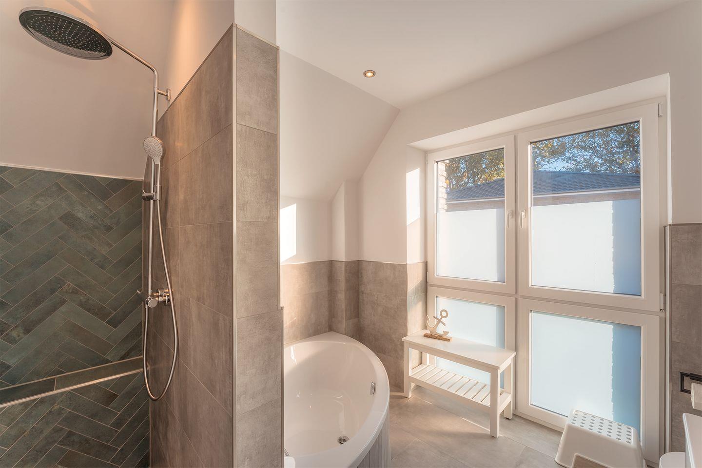 Duschbad im 1. OG: bodentiefe, barrierefreie Regendusche, Eckbadewanne, Waschtischanlage mit Spiegel, Abstellflächen, WC, Kindertritthocker, Handtuchheizung, Haartrockner