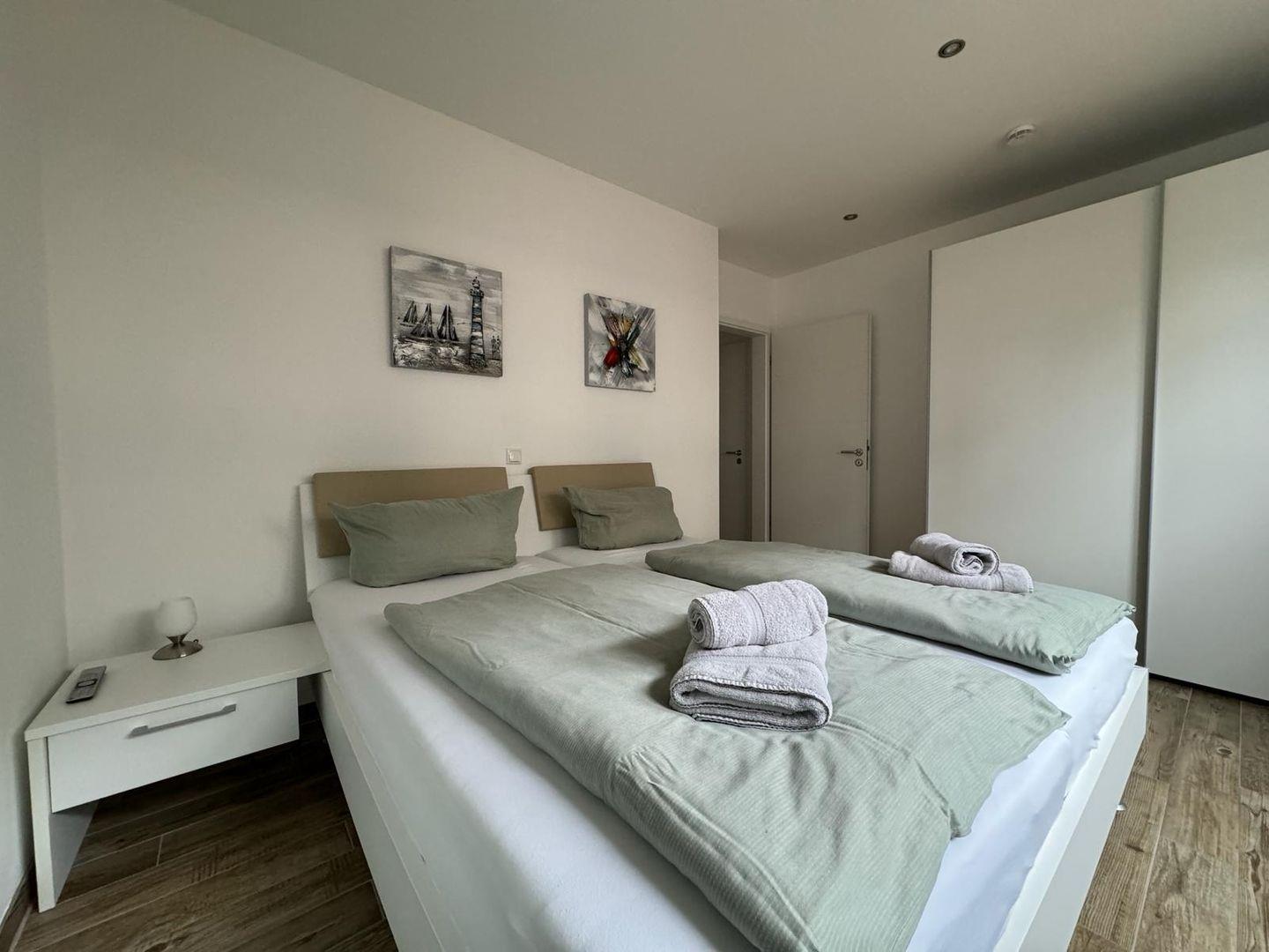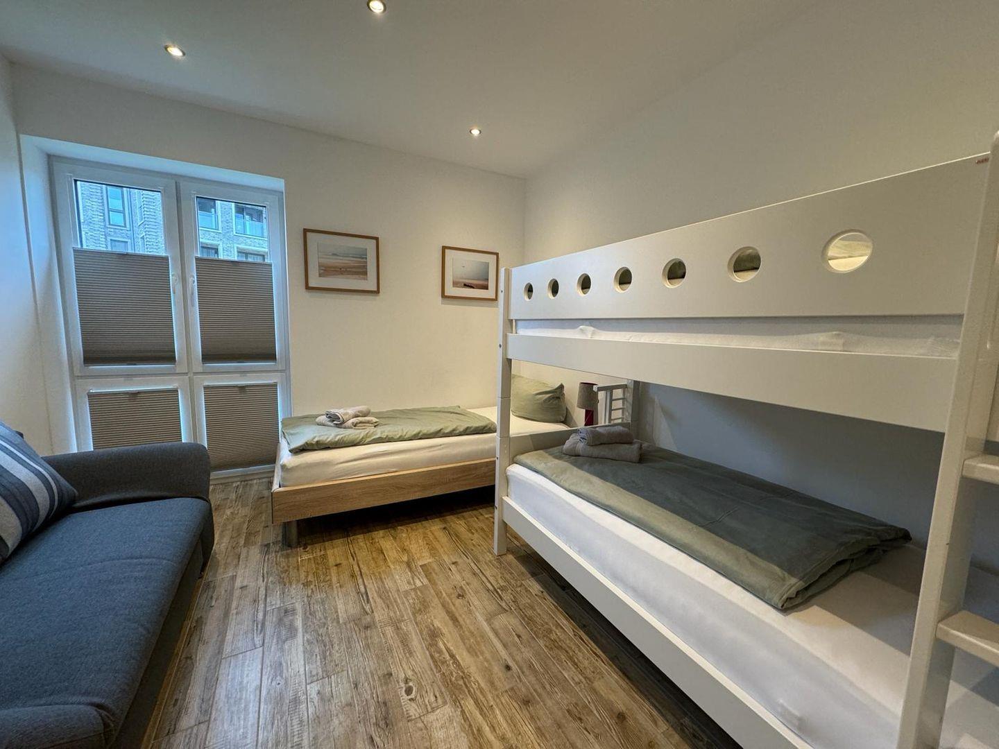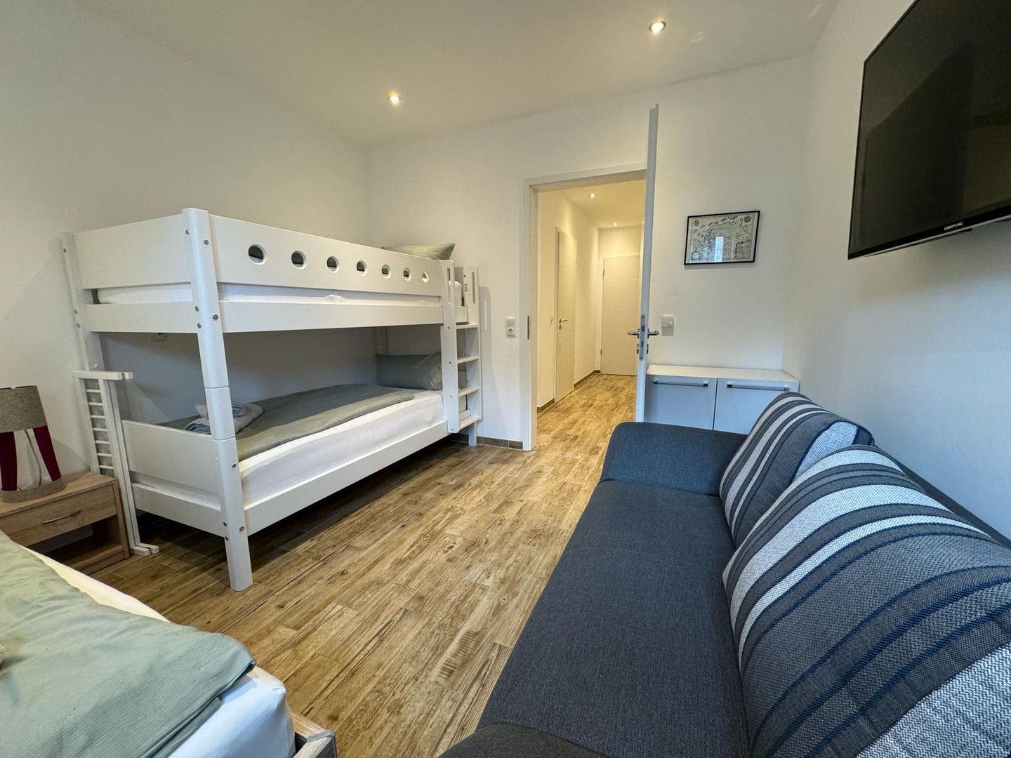 Es gibt ein Schlafzimmer mit Doppelbett und Flat-TV und ein Kinderzimmer mit einem Hochbett (2 Betten) und 1 Einzelbett, zusätzlich steht ein (Ein-Personen)-Schlafsofa zur Verfügung.