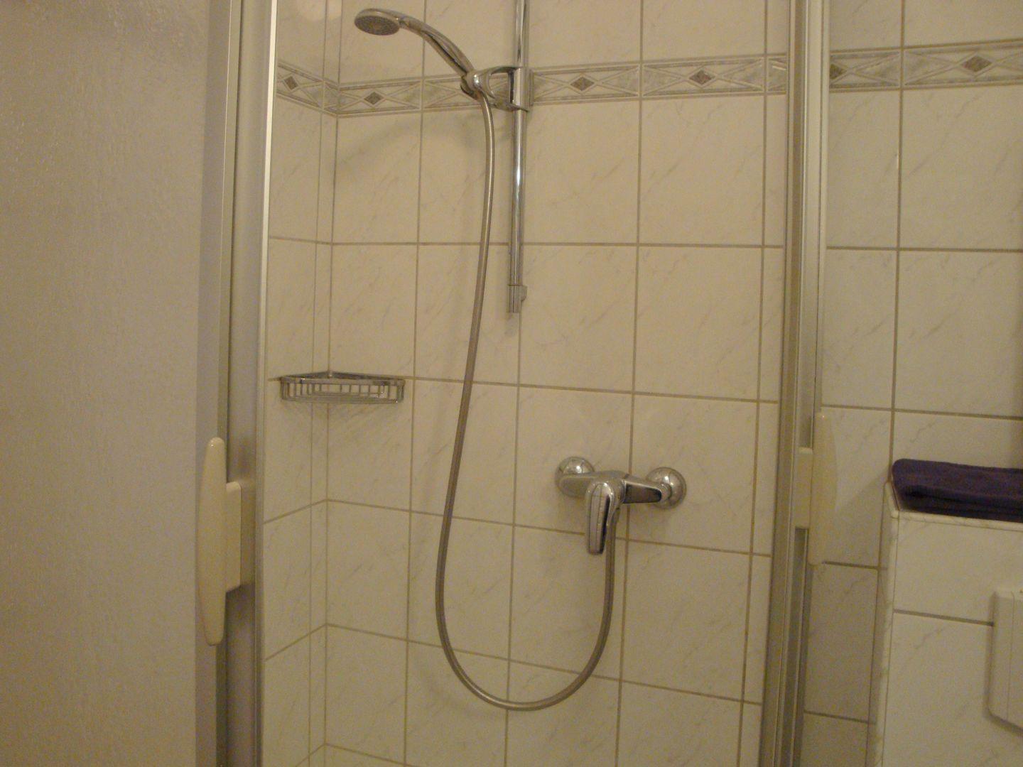 Badezimmer: 1 Badezimmer mit Dusche, Waschtisch, großer Spiegel