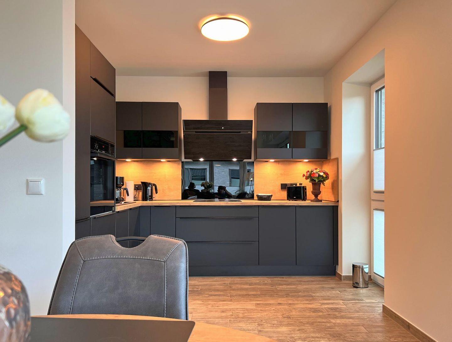 Küche und Haushalt: Einbauküche, Kühlschrank mit Gefrierfach, Induktionsherd, Dunstabzugshaube, Backofen, Geschirrspüler, Kaffeefiltermaschine, Toaster, Wasserkocher, hochwertiges Geschirr und Besteck, diverse Küchenutensilien