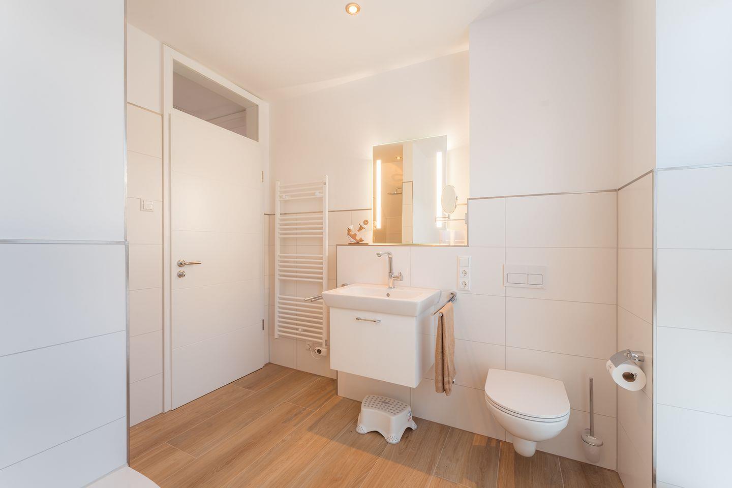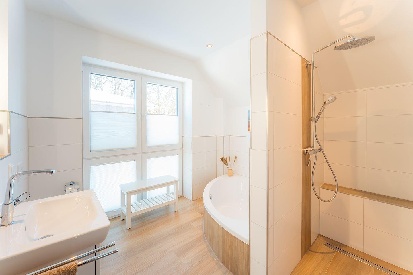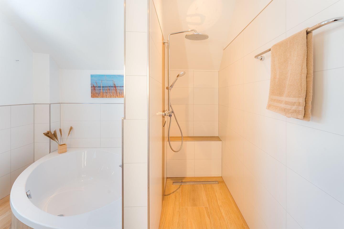 Bad und Sanitär im 1. OG: bodentiefe, barrierefreie Sommerregendusche, Badewanne, Waschtischanlage mit Spiegel, WC, Handtuchheizung, Föhn, Handtücher auf Anfrage