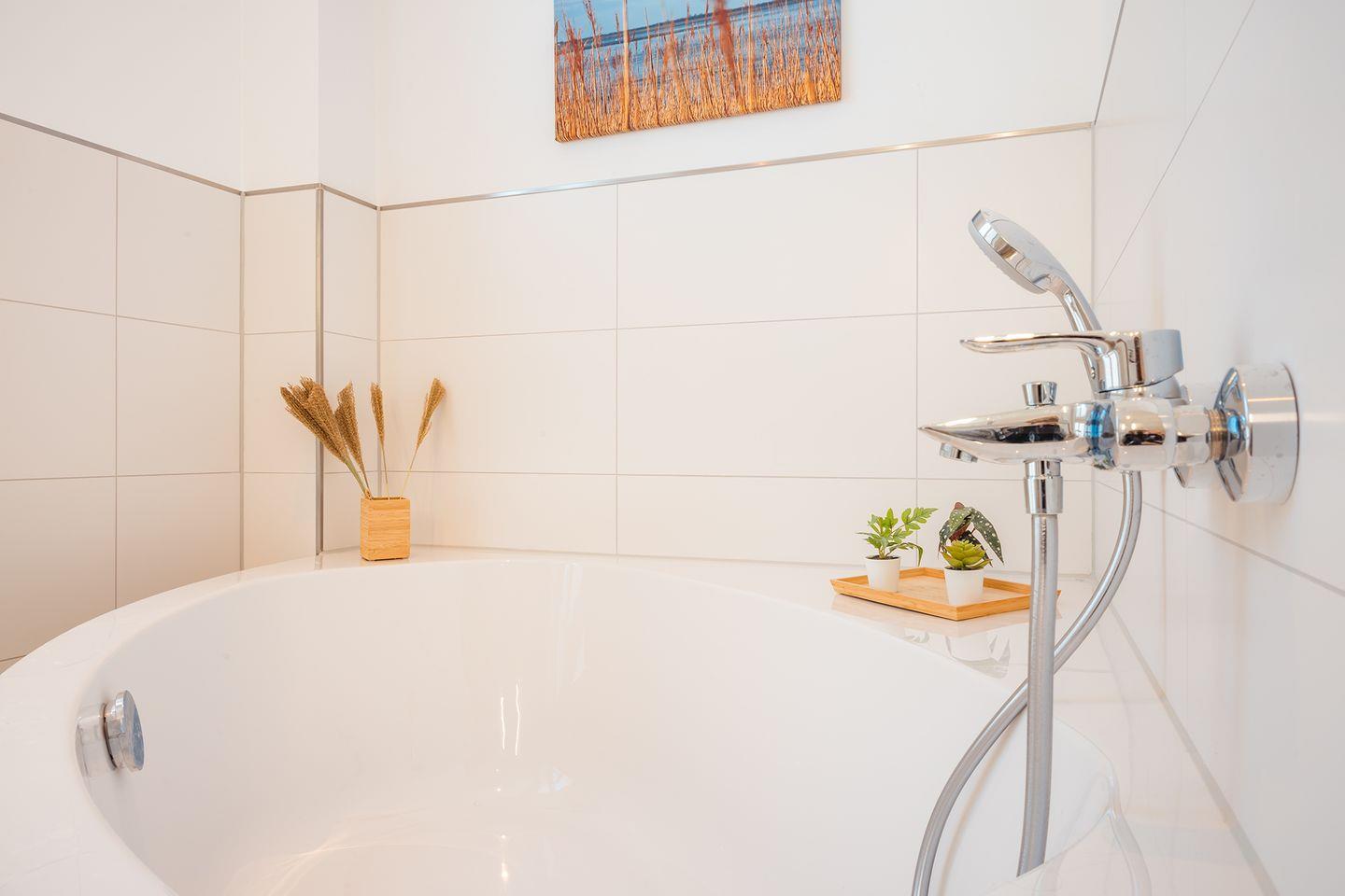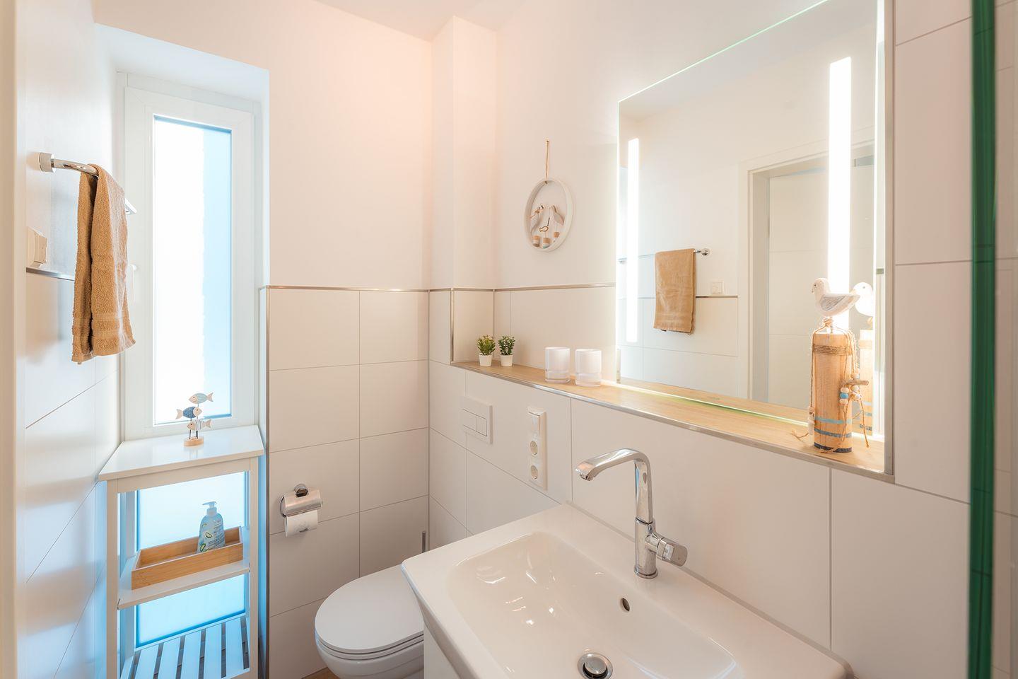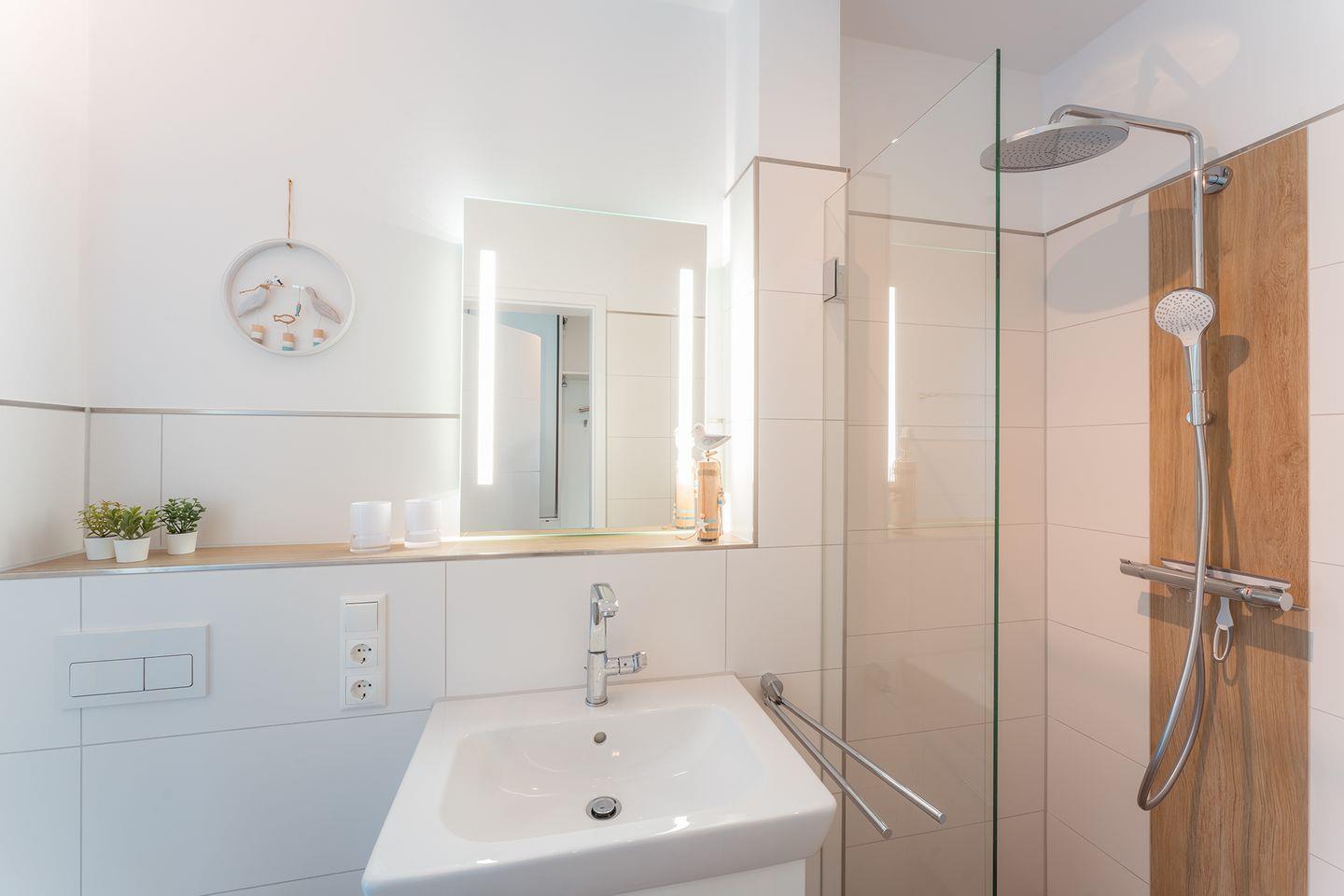 Bad und Sanitär im 1. OG: bodentiefe, barrierefreie Sommerregendusche, Badewanne, Waschtischanlage mit Spiegel, WC, Handtuchheizung, Föhn, Handtücher auf Anfrage