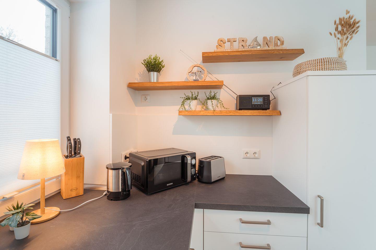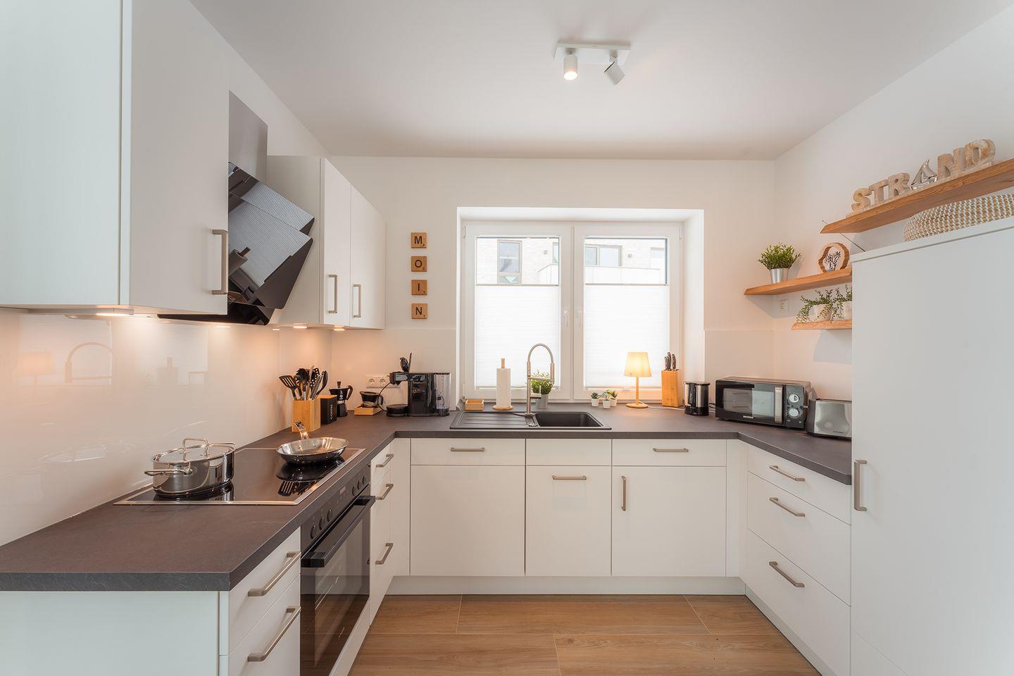 Küche und Haushalt: Einbauküche, Kühlschrank mit Gefrierfach, 4-Zonen Cerankochfeld, Backofen, Dunstabzugshaube, Mikrowelle, Geschirrspüler, Kaffeefiltermaschine + Kaffee-Padmaschine, Toaster, Wasserkocher, Eierkocher, hochwertiges Geschirr und Besteck + Kindergeschirr und Kinderbesteck