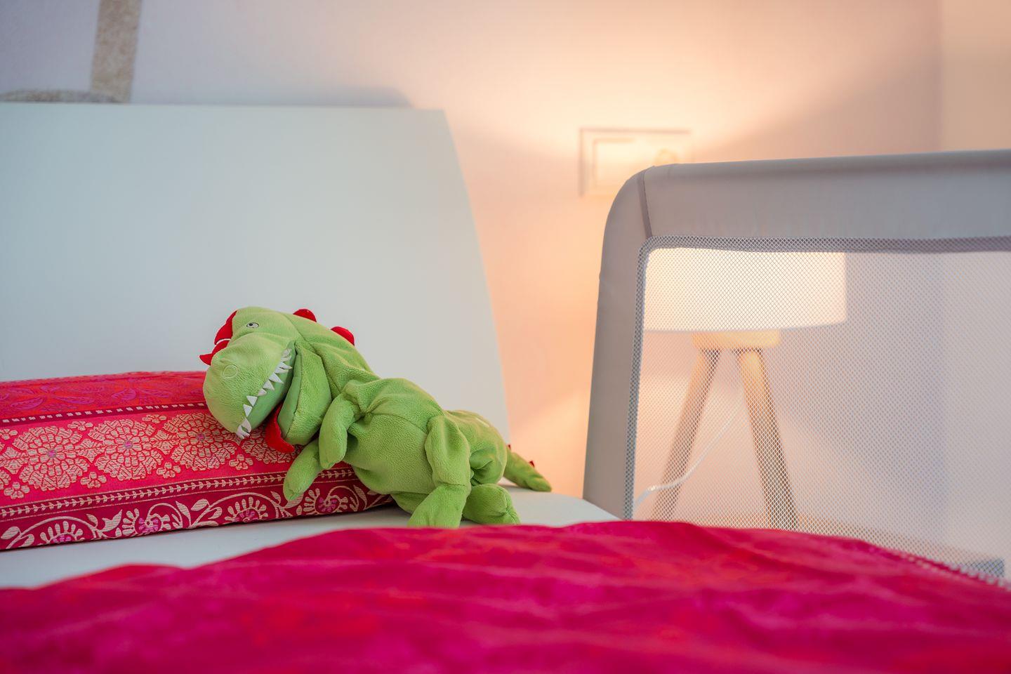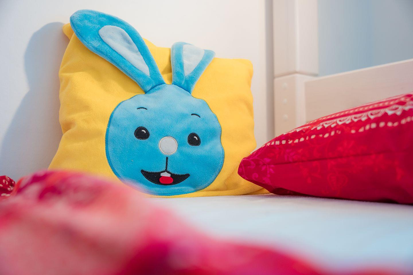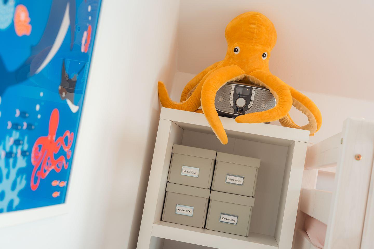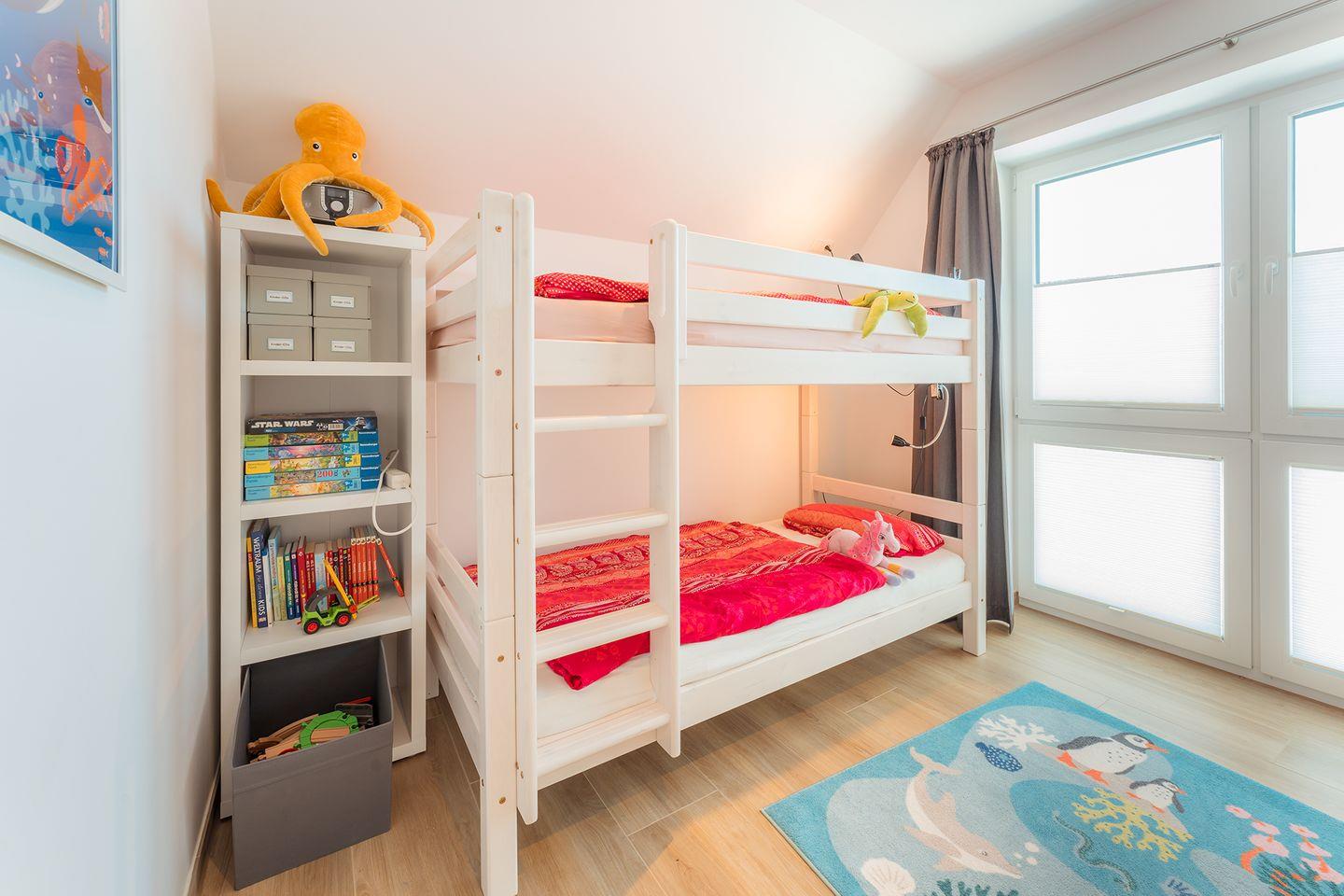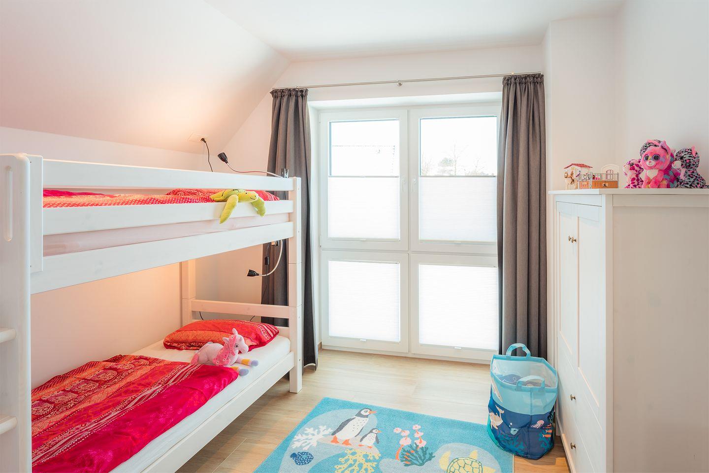 Schlafzimmer 3: 1 Stockbett (Maße: 90 x 200 cm, 90 x 200 cm), Kleiderschrank, Spielsachen, Kinderbücher, CD-Player und Kinder-Hörspiel-CDs, Verdunkelungsvorhänge