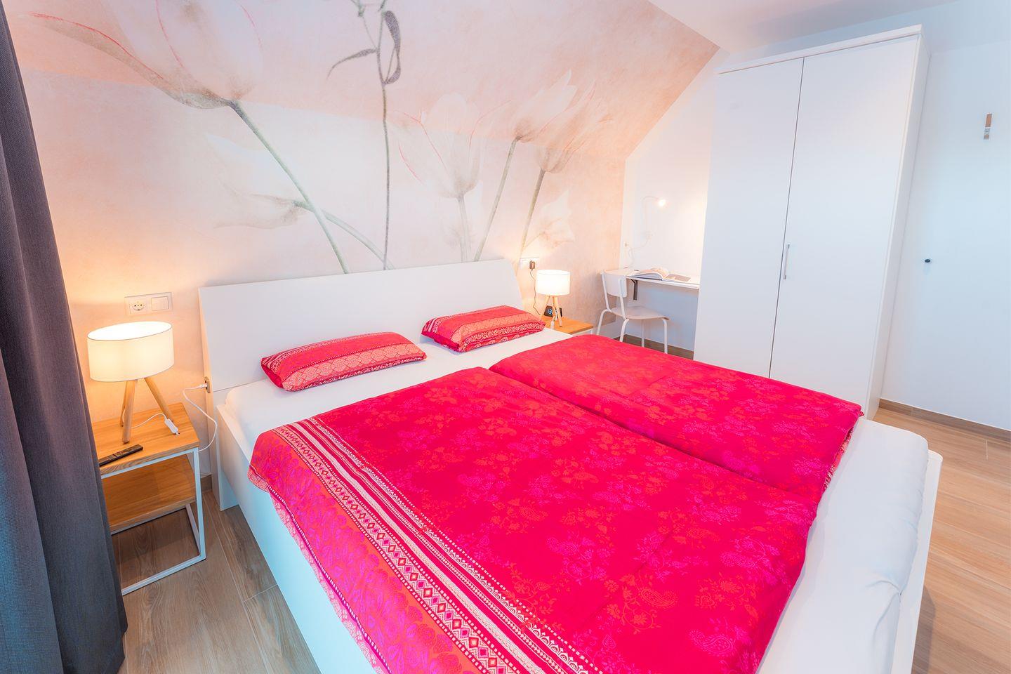 Schlafzimmer 2: Doppelbett (Maße: 180 x 200 cm, 2 Einzelmatratzen 90x200 cm), Nachttische, Kleiderschrank, Flachbildfernseher (Smart TV), Verdunkelungsvorhänge