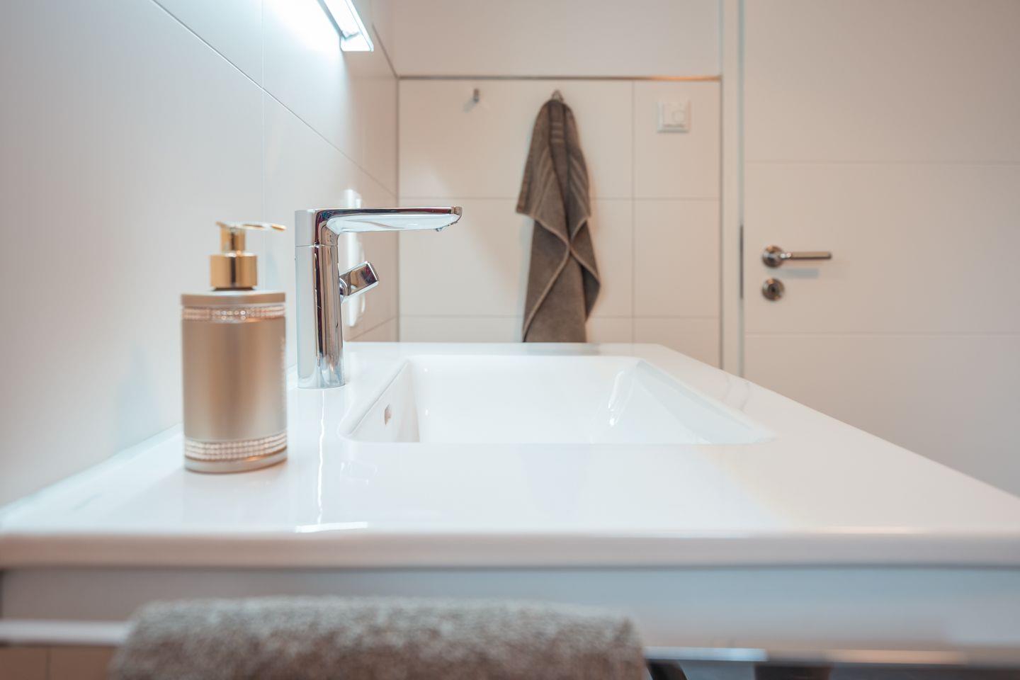 Tageslichtbad: bodentiefe, barrierefreie Sommerregendusche, Waschtischanlage mit Spiegel, Föhn, WC, Handtuchheizung, Waschmaschine, Trockner, Verdunklungs-Plissees, Handtücher auf Anfrage