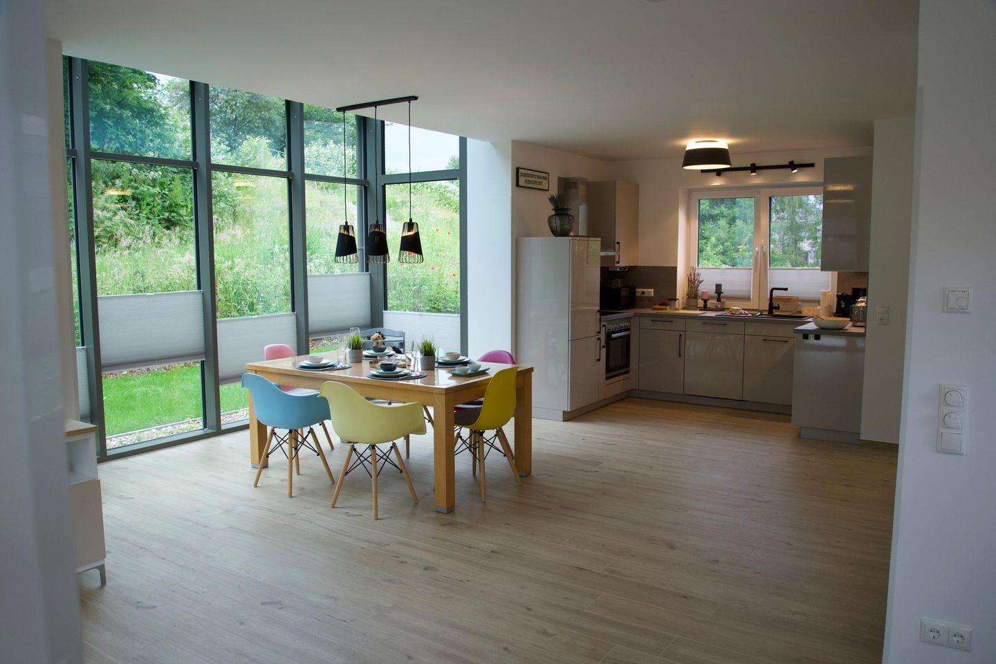 Ferienhaus mit Spielzimmer und Garten Unser modernes und komfortables Ferienhaus in Dangast bietet Platz für bis zu 6 Personen und verspricht einen erholsamen Urlaub an der Nordsee. Die bodentiefen Fenster lassen viel Tageslicht herein und sorgen für ein Gefühl, mitten in der Natur zu sein. Besonders im Herbst und Winter bietet das helle Wohnzimmer eine kuschelige Atmosphäre.