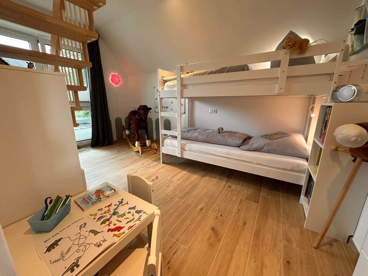 Kinderzimmer 1: Hochbett mit 2 Schlafplätzen je 90x200cm, Leselampen, Staufächer am Bett, Schrank, Schaukelpferd, Bücher, Spielzeug, Zugang zum extra Spielzimmer auf dem hellen ausgebauten Spitzboden.
