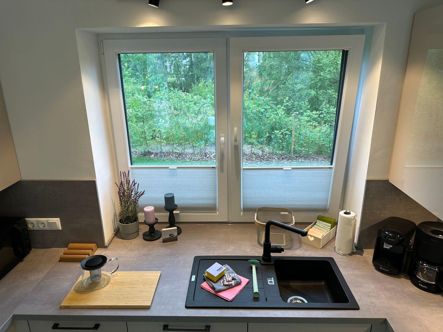 Küche und Haushalt: Einbauküche, Kühlschrank mit kombinierten Gefrierfächern (2 Stück), 4-Zonen Cerankochfeld, Dunstabzugshaube, Mikrowelle, Backofen, Geschirrspüler, Toaster, Eierkocher, Stabmixer, 3-Mix, Wasserkocher, Kaffeefiltermaschine (Filtergröße 4), Kaffeemaschine Tassimo, hochwertiges Geschirr und Besteck