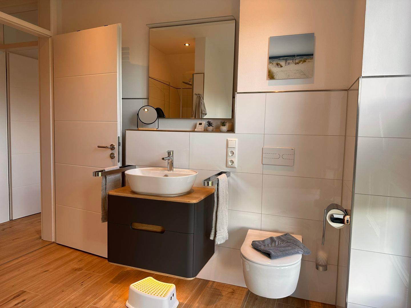 Tageslichtbad: bodentiefe, barrierefreie Sommerregendusche, Waschtischanlage mit Spiegel, Föhn, WC, Handtuchheizung, Waschmaschine und Trockner, Handtücher & Badematten auf Anfrage