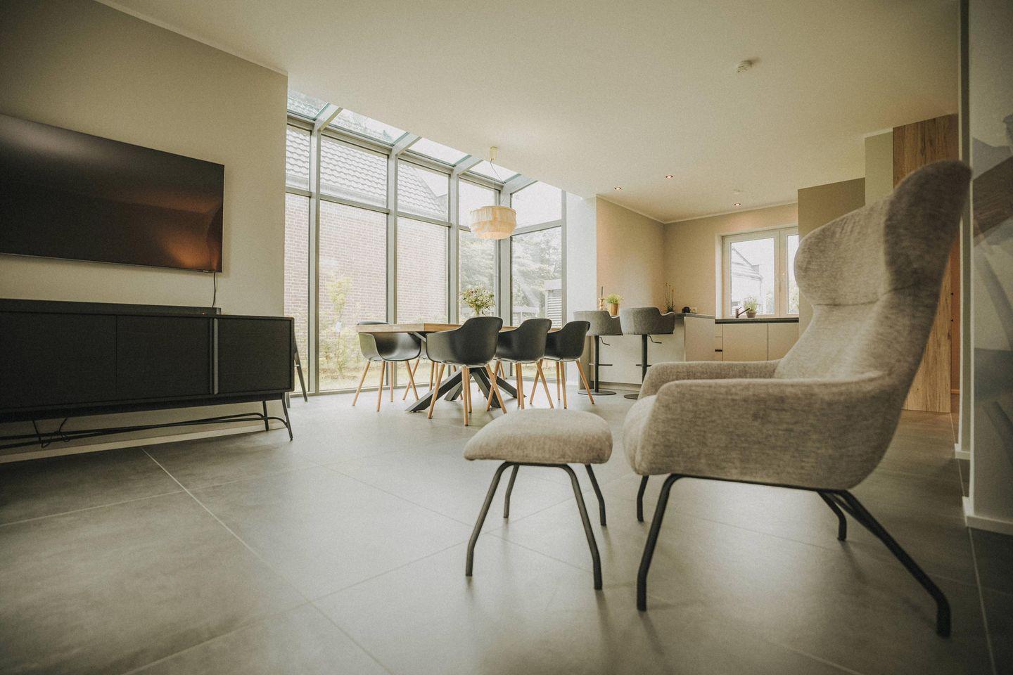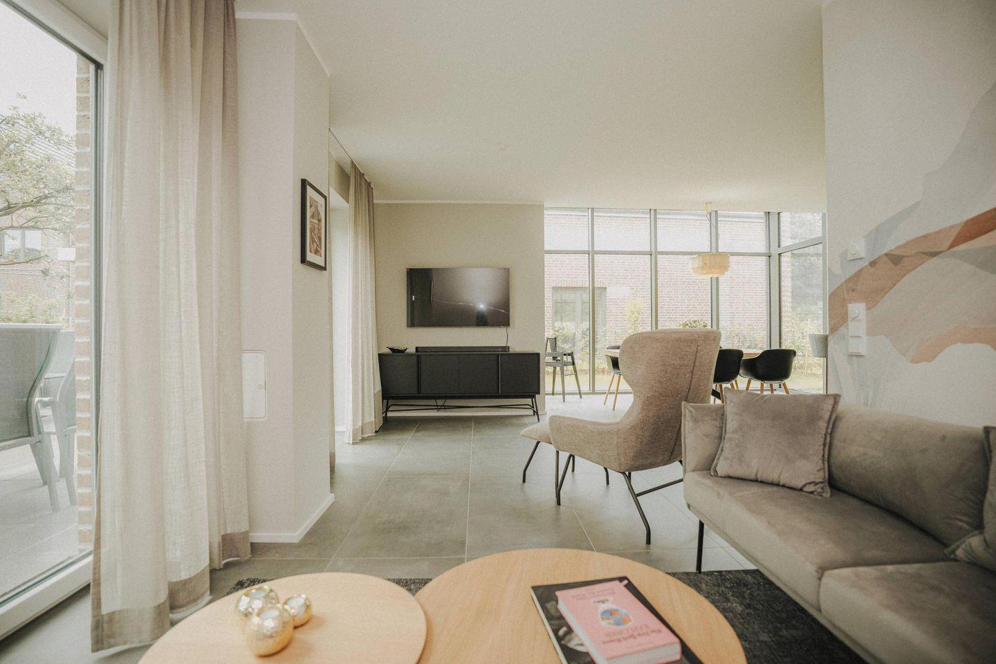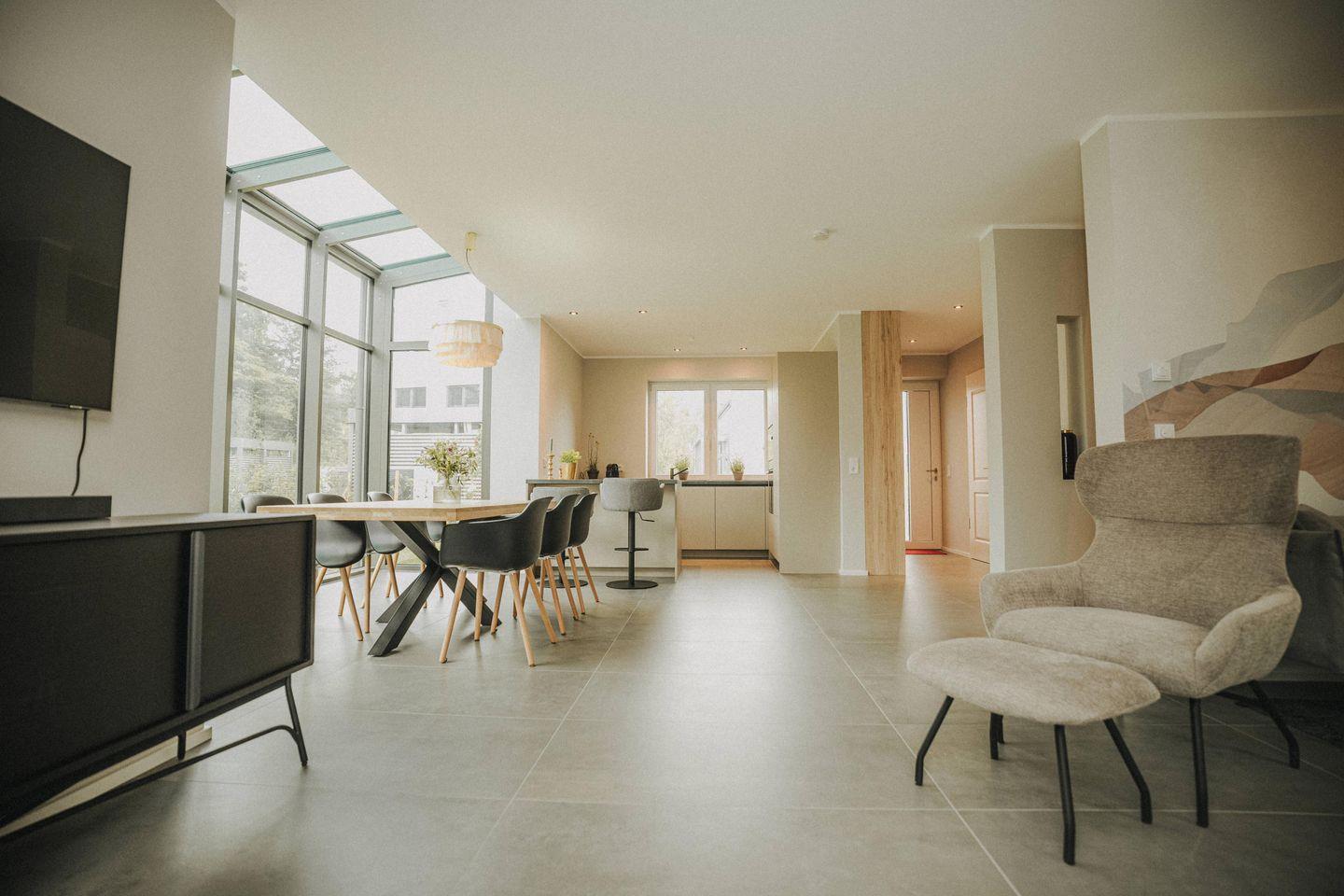 An dem großen Esstisch finden problemlos 6 – 8 Personen Platz und für die Kleinen steht ein Hochstuhl zur Verfügung. Von der gemütlichen Couch für mehrere Personen und dem Lesesessel können Filme gestreamt oder geschaut werden. Es ist auch ein wunderbarer Platz für Gesellschaftsspiele.