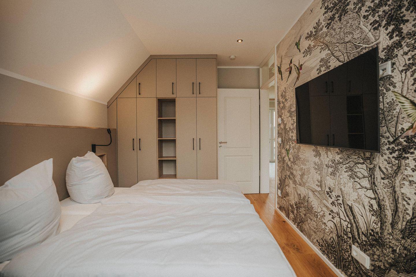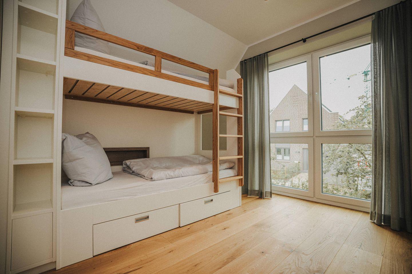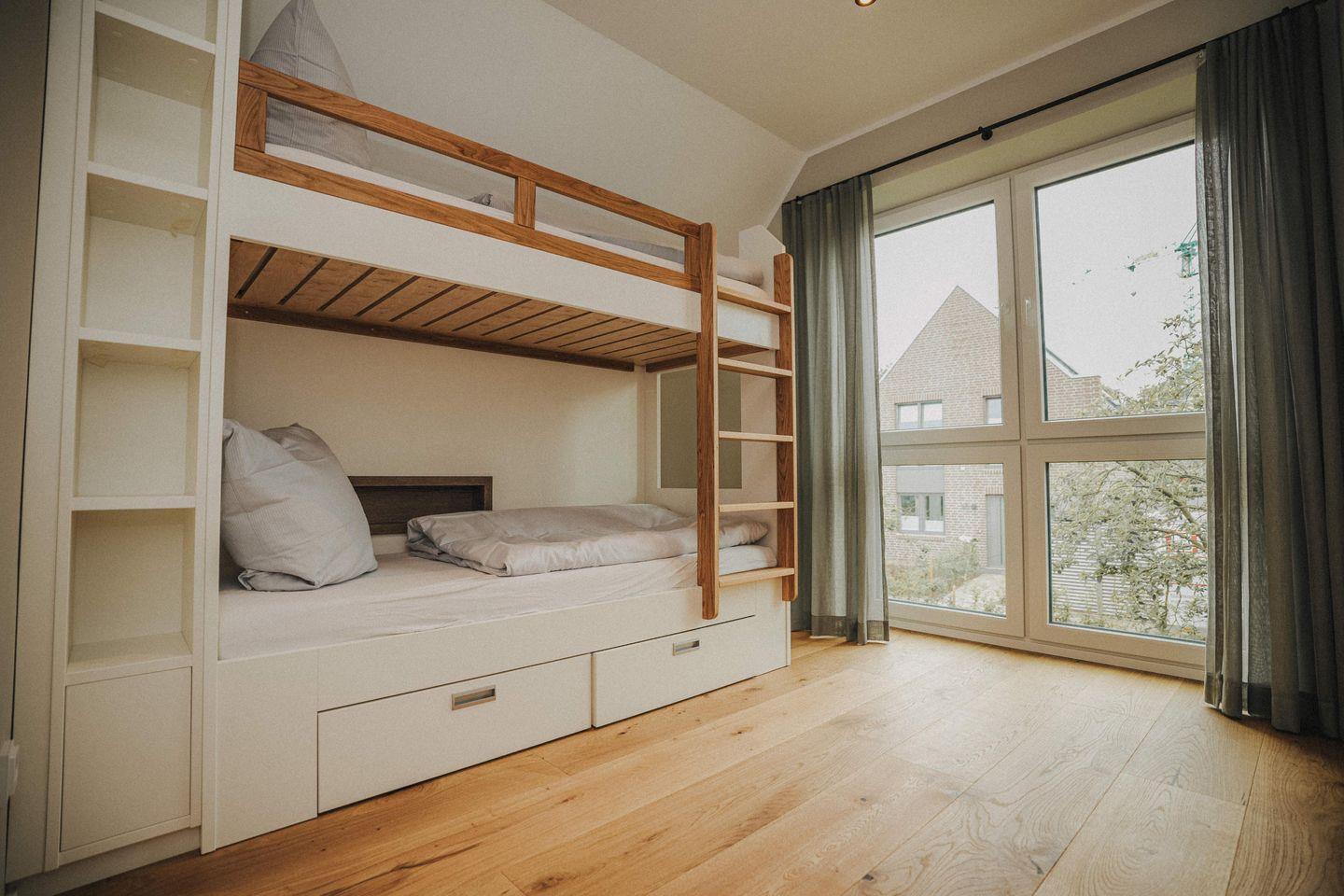 Im Obergeschoss befinden sich drei Schlafzimmer, deren maßgefertigte Einbauschränke viel Stauraum bieten. Zwei Schlafzimmer sind mit ebenfalls maßgefertigten hochwertigen Doppelbetten (1,80 m x 2,00 m) ausgestattet. In den beiden Zimmern befindet sich ebenfalls ein LED-TV. Das vom Schreiner angefertigte zweigeschossige Hochbett im dritten Schlafzimmer bietet ausreichend Platz für kleine und große Gäste.