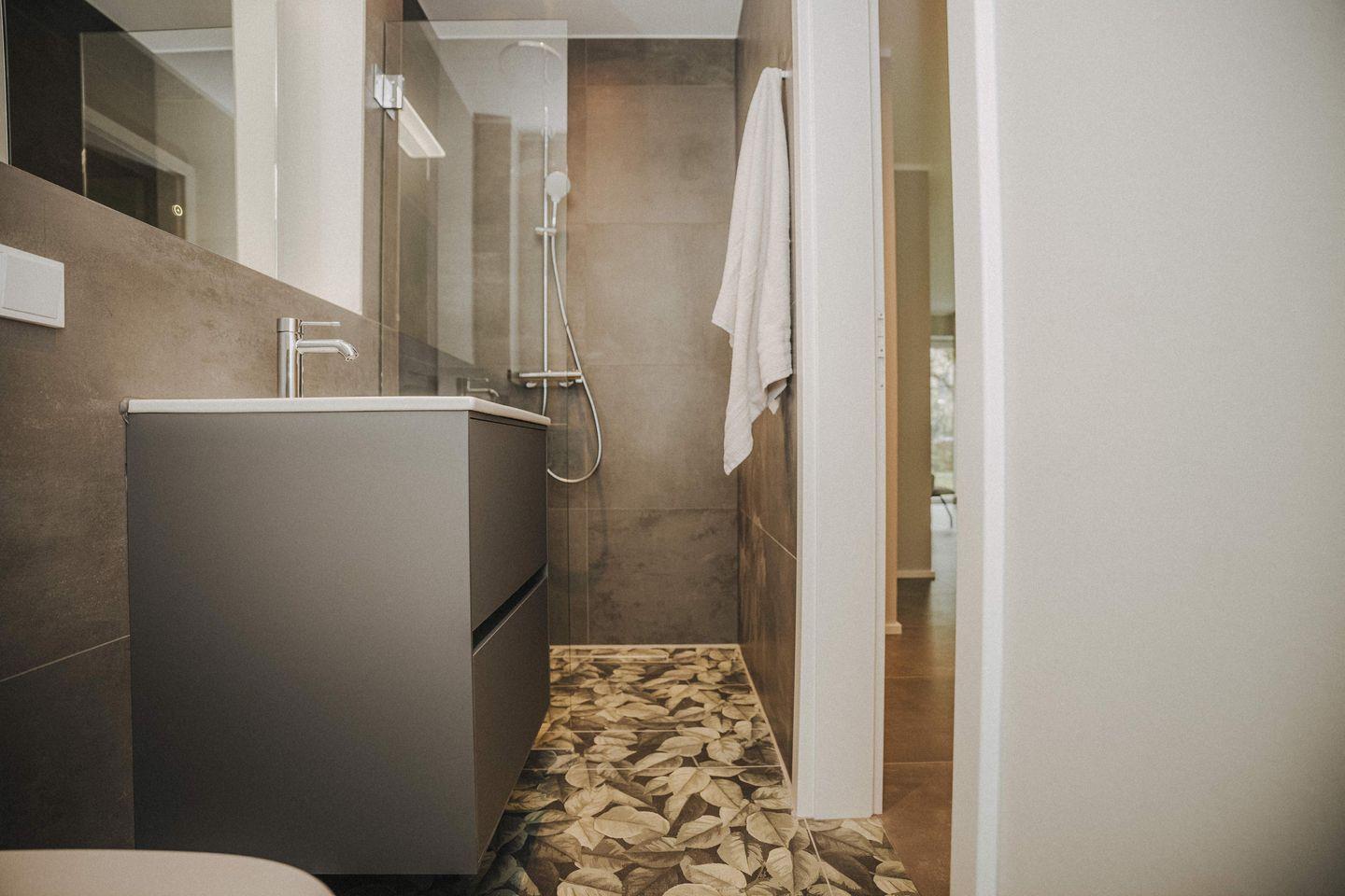 Das Bad im Eingangsbereich verfügt auch über eine großzügige Dusche und im Hauswirtschaftsraum befinden sich Waschmaschine und Trockner, damit Sie sich im Urlaub um nichts sorgen müssen.