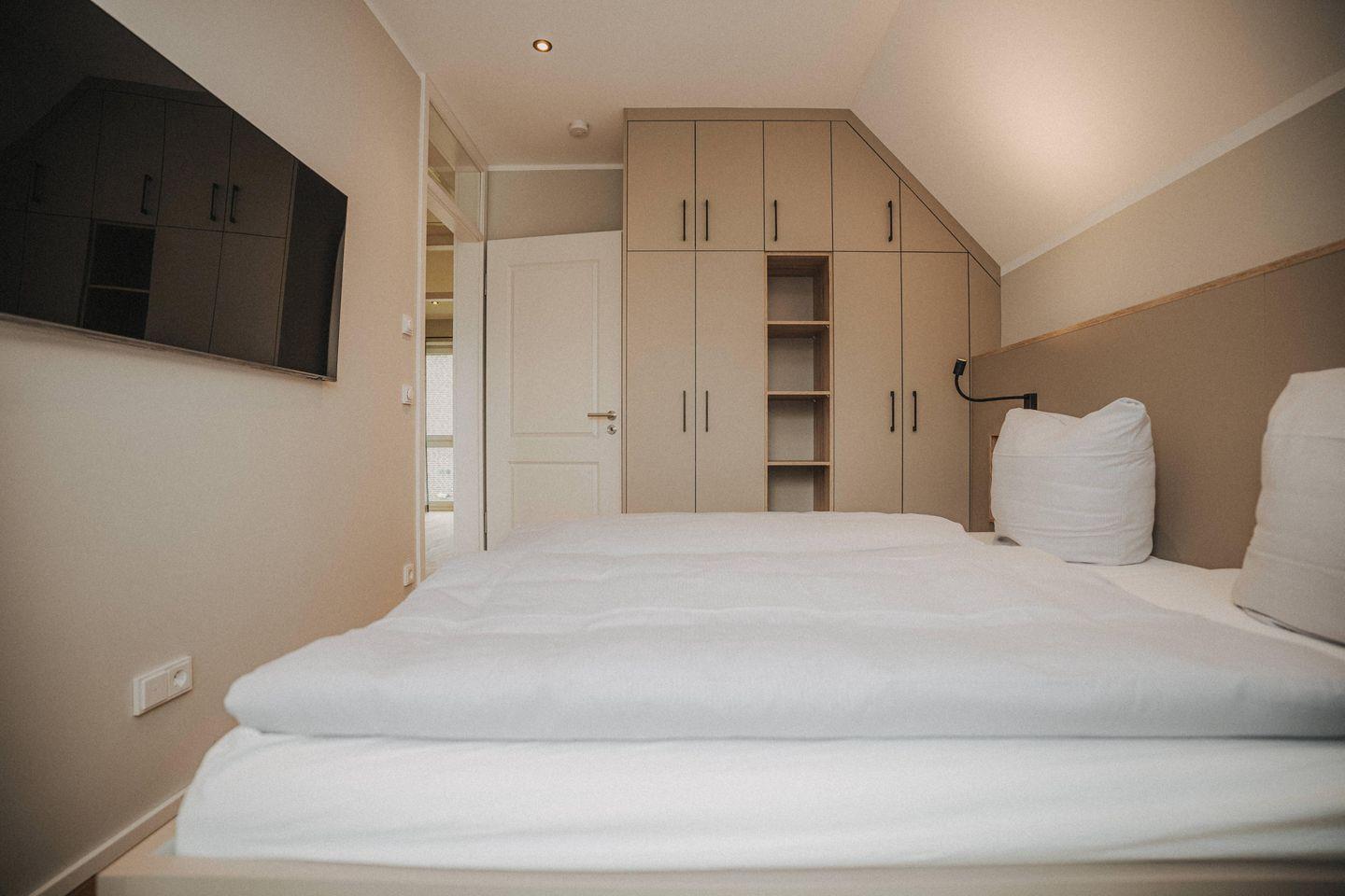 Schlafzimmer 2: Doppelbett (Maße: 180 x 200 cm / 2 Einzelmatratzen 90 x 200 cm), Nachttische, Leselampen, Kleiderschrank, Smart-TV, Verdunklungsmöglichkeit