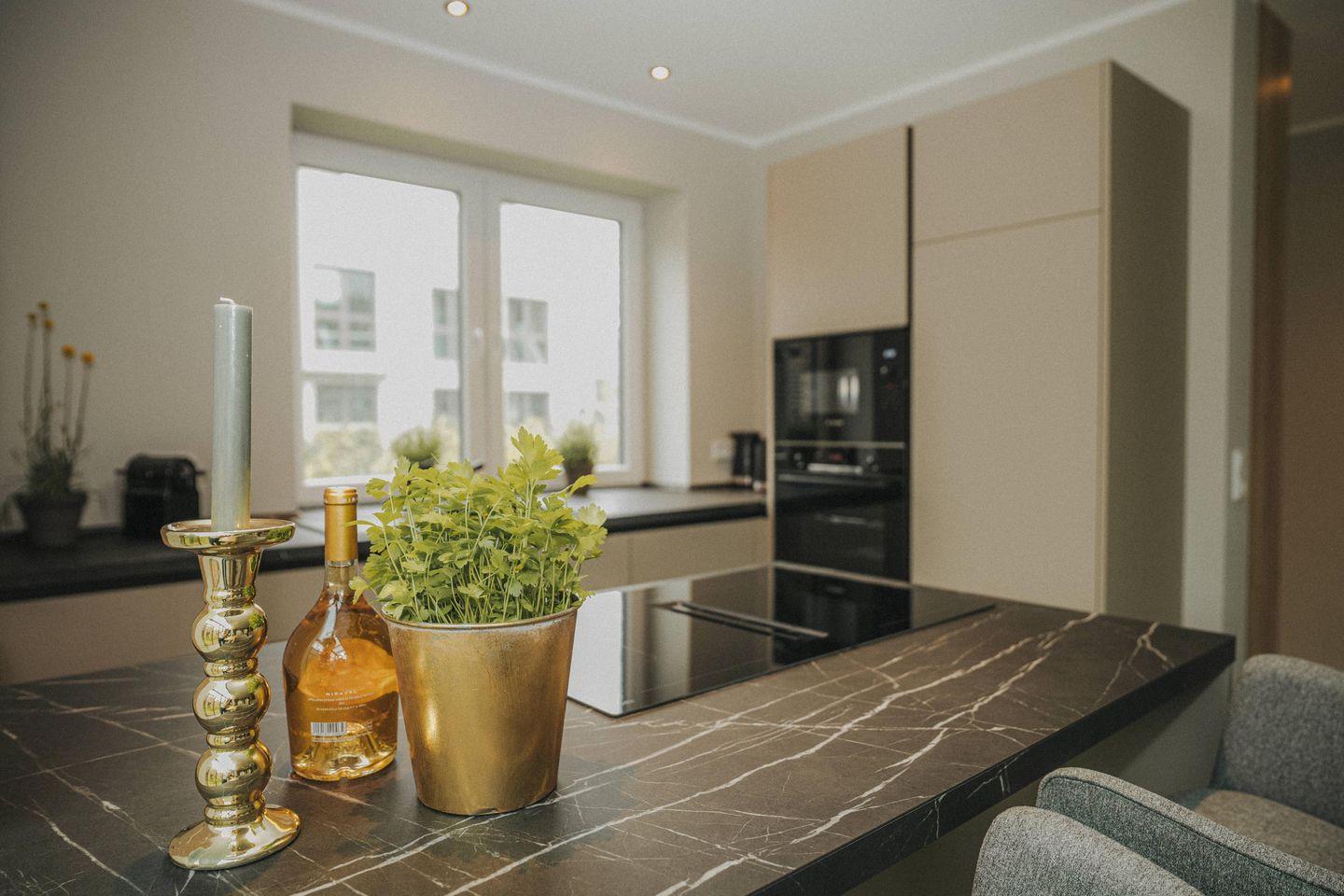 Küche und Haushalt: hochwertige Einbauküche mit Markengeräten, Kühlschrank mit Gefrierfach, 4-Zonen Cerankochfeld mit integriertem Dunstabzug, Backofen, Geschirrspüler, Nespressomaschine, Toaster, Wasserkocher, Wassersprudler, hochwertiges Geschirr und Besteck, diverse Küchenutensilien