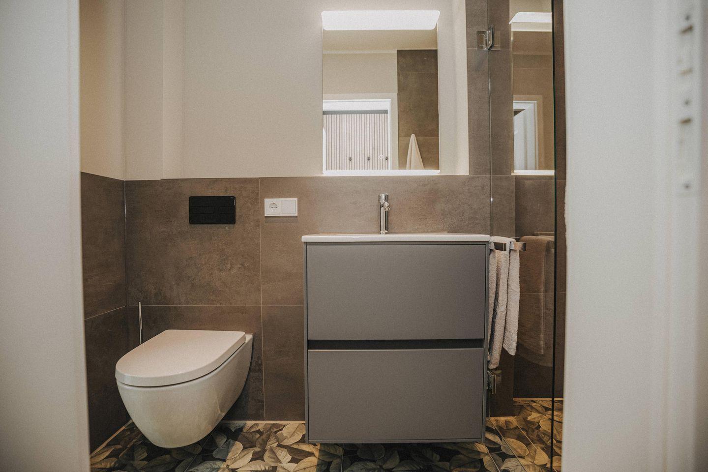 Duschbad im EG: bodentiefe, barrierefreie Regendusche, Waschtischanlage mit Spiegel, Abstellflächen, WC