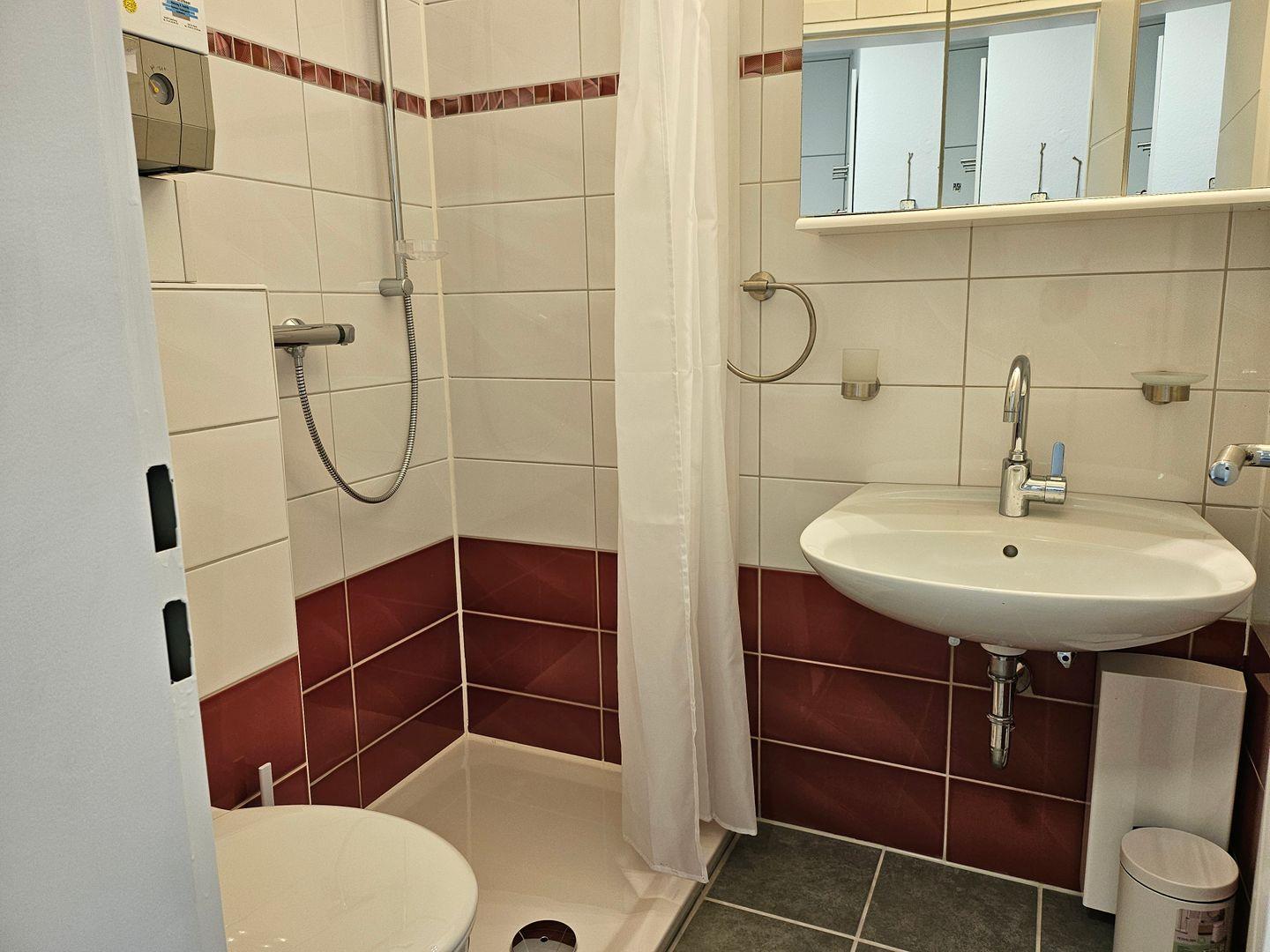 Das Badezimmer ist mit einer Dusche, Waschbecken, WC, Fön und einem Lüftungsabzug ausgestattet.