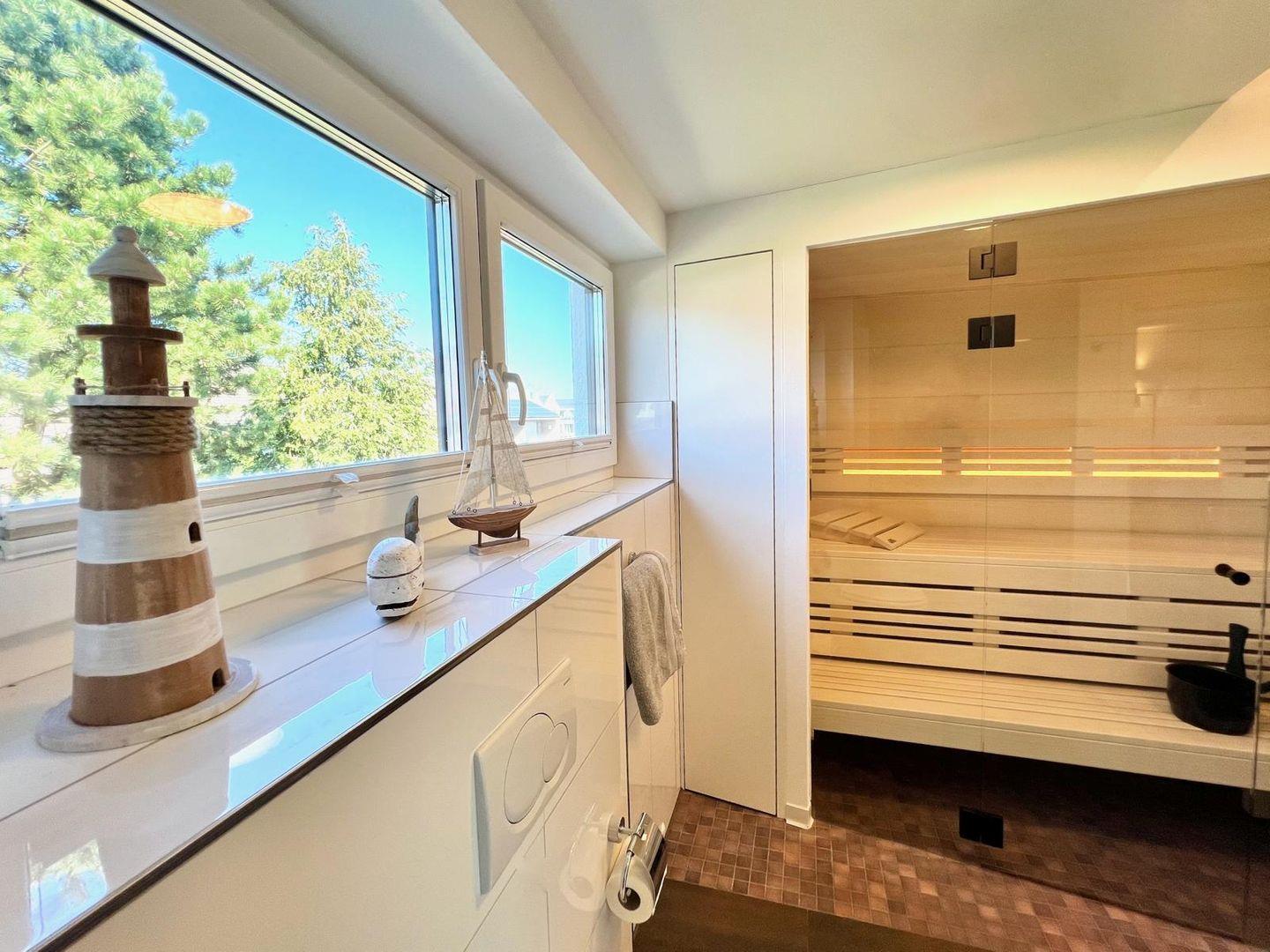 Das Apartment verfügt über ein modernes Badezimmer mit Sauna, bodengleicher Dusche, Waschbecken und WC. Ein Haartrockner und Bettwäsche sind für Sie bereitgestellt. Zusätzlich sorgt die Fußbodenheizung in der gesamten Wohnung für ein angenehmes Wohnklima, auch an kühleren Tagen.