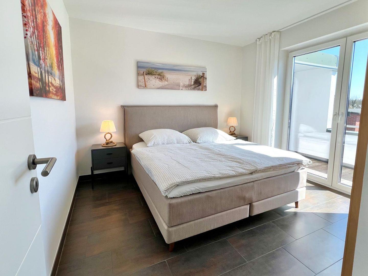 Im ersten Schlafzimmer steht ein Boxspringbett in der Größe 180 x 200 cm (1 Matratze 180x200 cm). Ein großer Kleiderschrank bietet viel Stauraum für Ihre Kleidung.