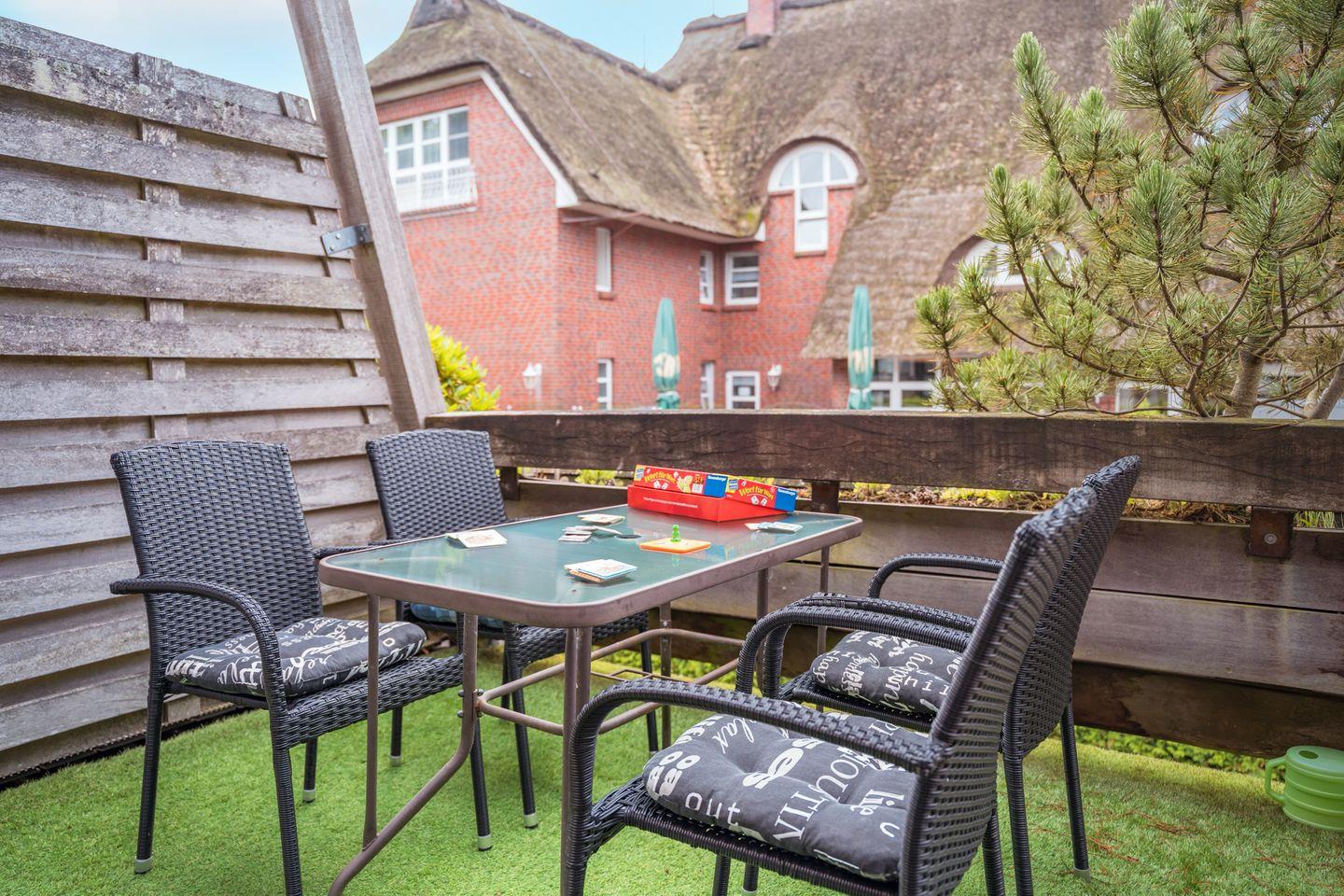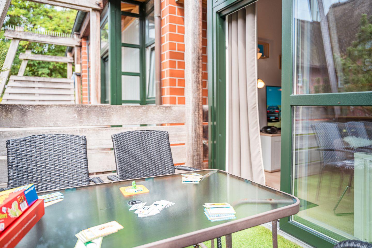 Ein besonderes Highlight des Apartments ist der eigene Südbalkon, der mit Gartenmöbeln, einem Sonnenschirm und einem Elektrogrill ausgestattet ist. Hier können Sie entspannte Stunden im Freien verbringen.