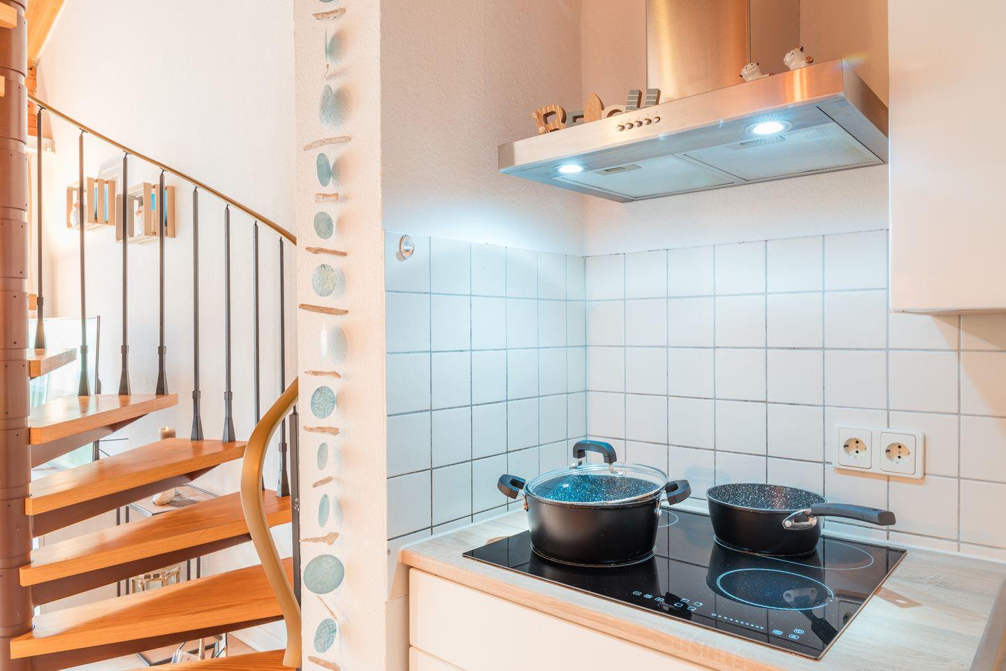 Die Küche ist zum Wohnzimmer hin offen und besticht durch ein umfangreiches Angebot an modernen Geräten. Dazu gehören eine Kühl-Gefrierkombination, ein Ceranherd mit Elektro-Backofen, eine Mikrowelle, eine Kaffeemaschine sowie eine Tassimo-Espressomaschine. Geschirrspüler, Toaster, Wasserkocher und alle nötigen Küchenutensilien sind vorhanden, damit Sie problemlos auch während des Urlaubs Ihre Lieblingsspeisen zubereiten können.
