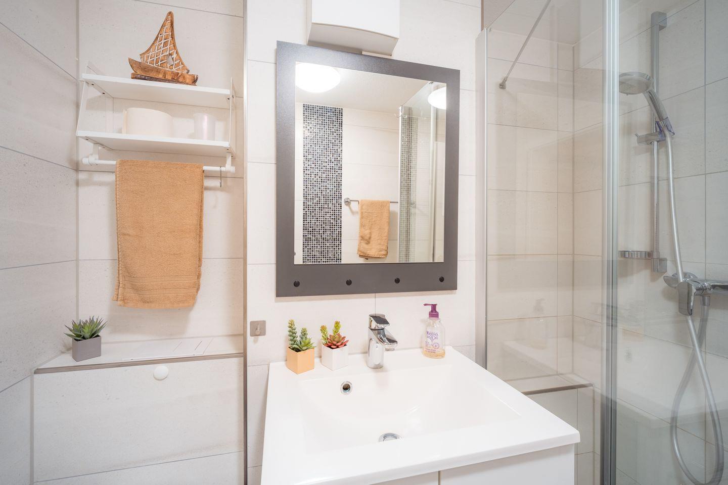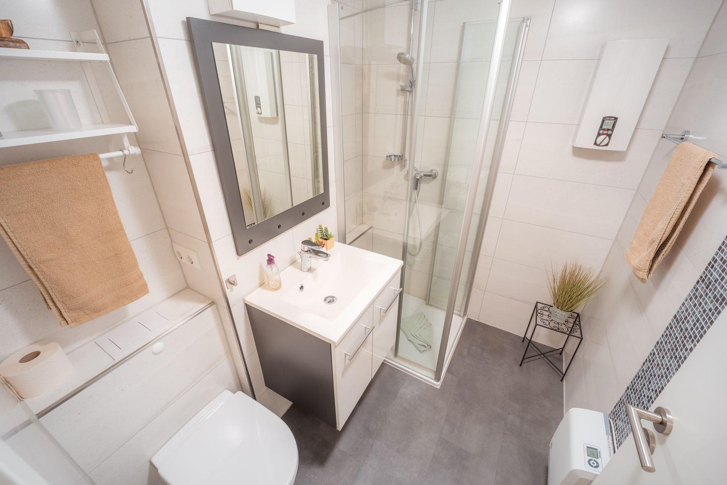 Das Badezimmer ist mit einer bodengleichen Dusche, WC, Waschbecken und Spiegel modern und funktional ausgestattet.