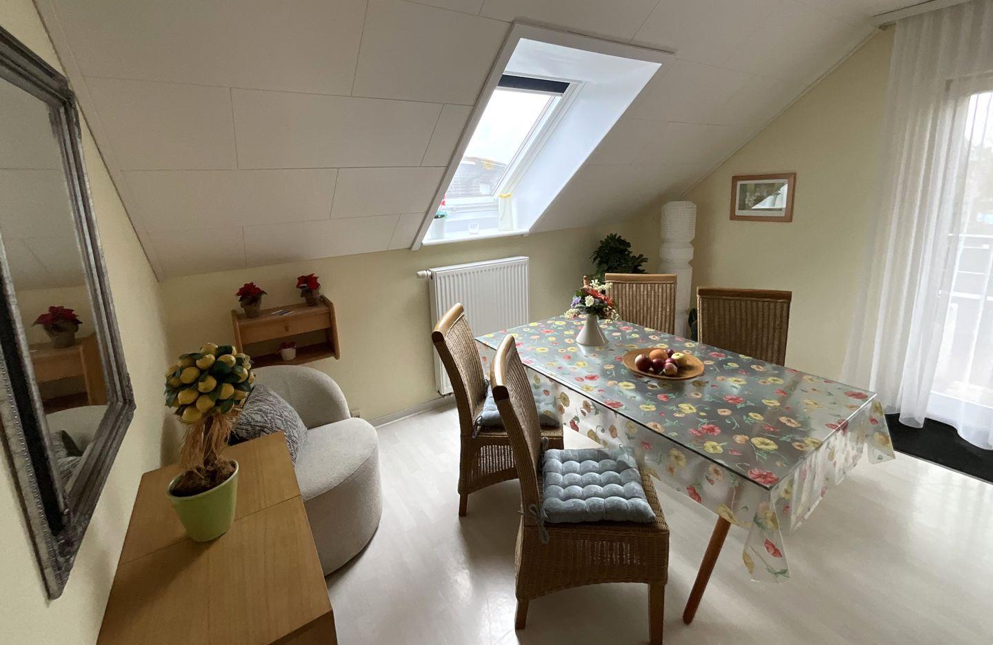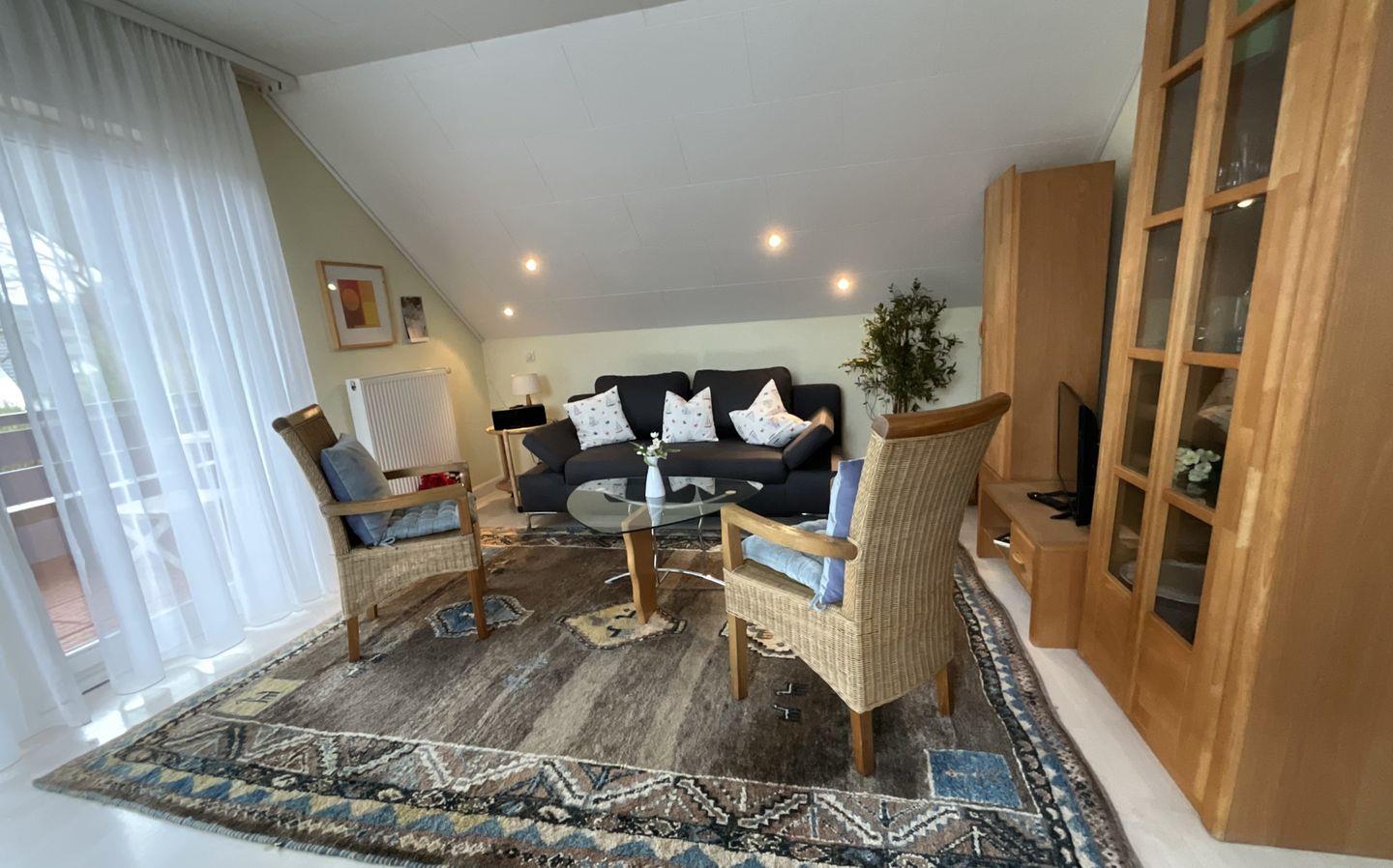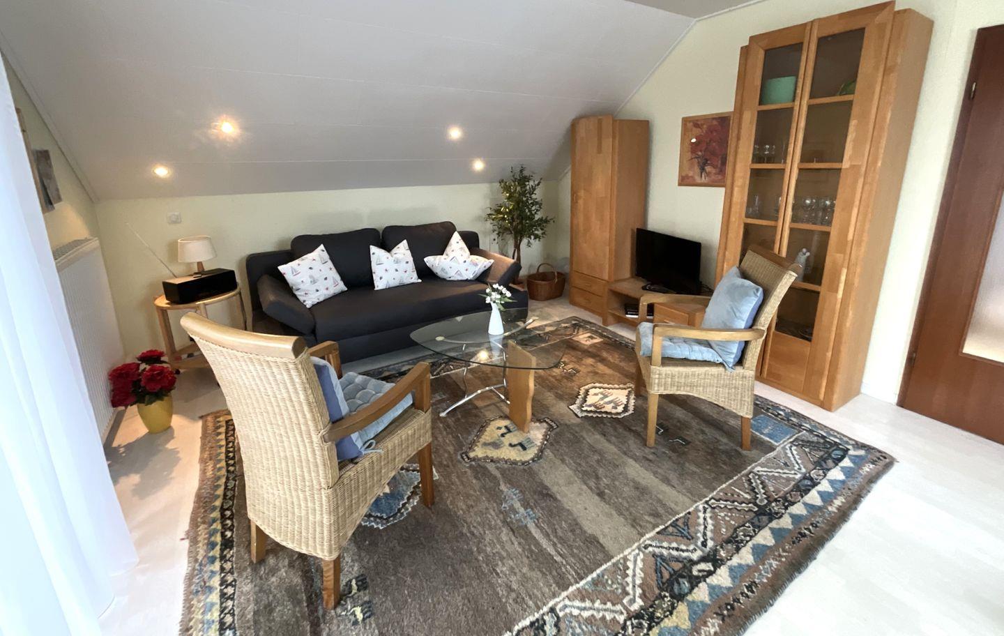 Der Wohnbereich ist mit Sofaecke, Sofa, Sessel, Esstisch und Essbereich eingerichtet und einem TV-Gerät, Radio sowie Internet/WLAN ausgestattet. Bücher stehen ebenfalls zur Verfügung. Sichtschutz in den Dachschrägen und Rolläden an den übrigen Fenstern unterstützen eine ungestörte Atmosphäre.