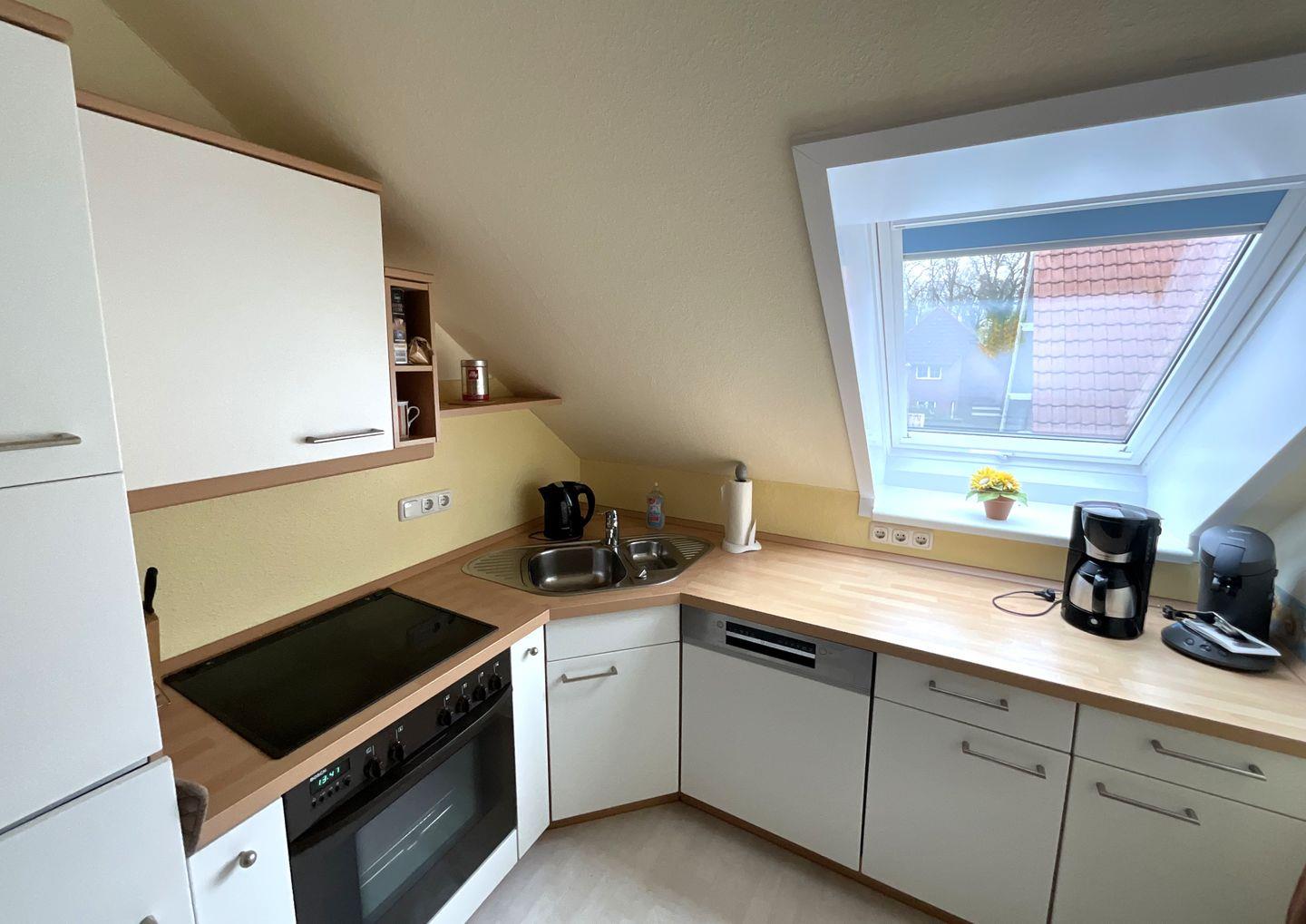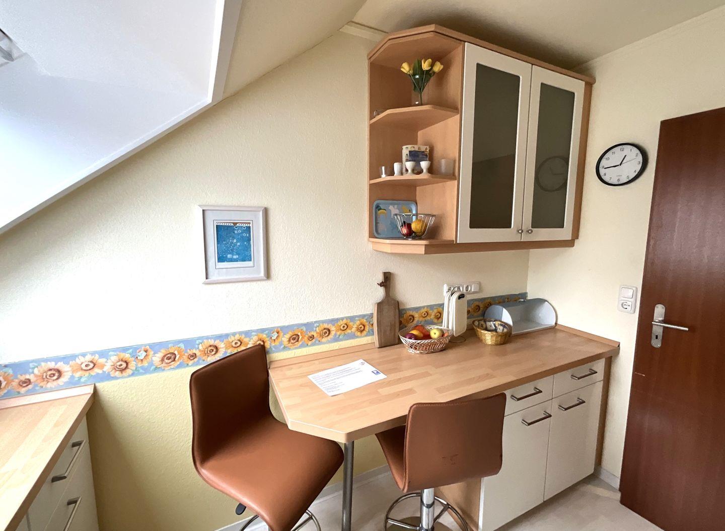 Küche und Haushalt: Einbauküche, Kühlschrank mit Gefrierfach, 4-Zonen Cerankochfeld, Backofen, Geschirrspüler, Toaster, Wasserkocher, Kaffeefiltermaschine, Senseo Padmaschine, hochwertiges Geschirr und Besteck