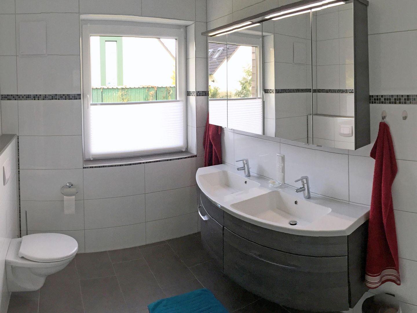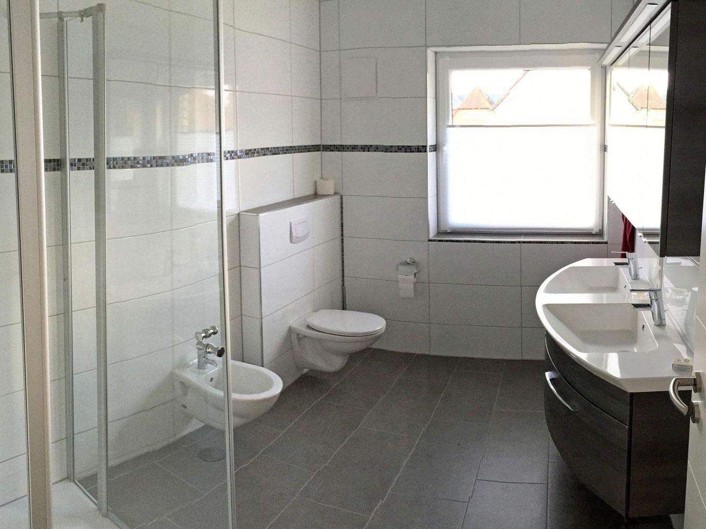 Beide Sanitärräume verfügen über Tageslicht, das Duschbad zusätzlich über ein Bidet und einen Waschtisch mit zwei Waschbecken und ausreichend Stauraum. Selbstverständlich ist die Duschkabine bodentief.