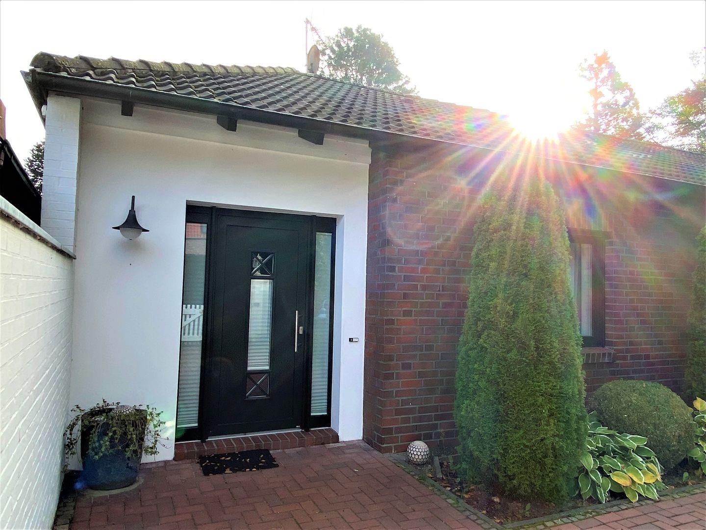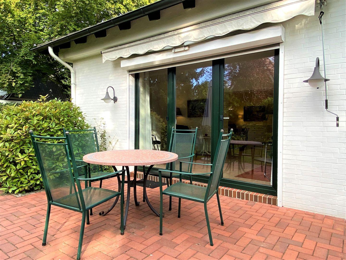 Sie wohnen auf einer Ebene in einem freistehenden Haus mit großzügiger Gartenanlage. Das Grundstück ist größtenteils eingezäunt mit Südterrasse, Markise, Gartenmöbeln.