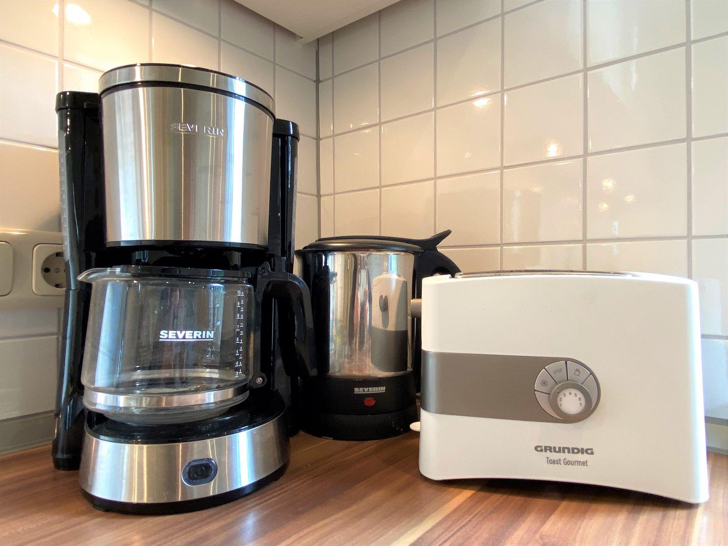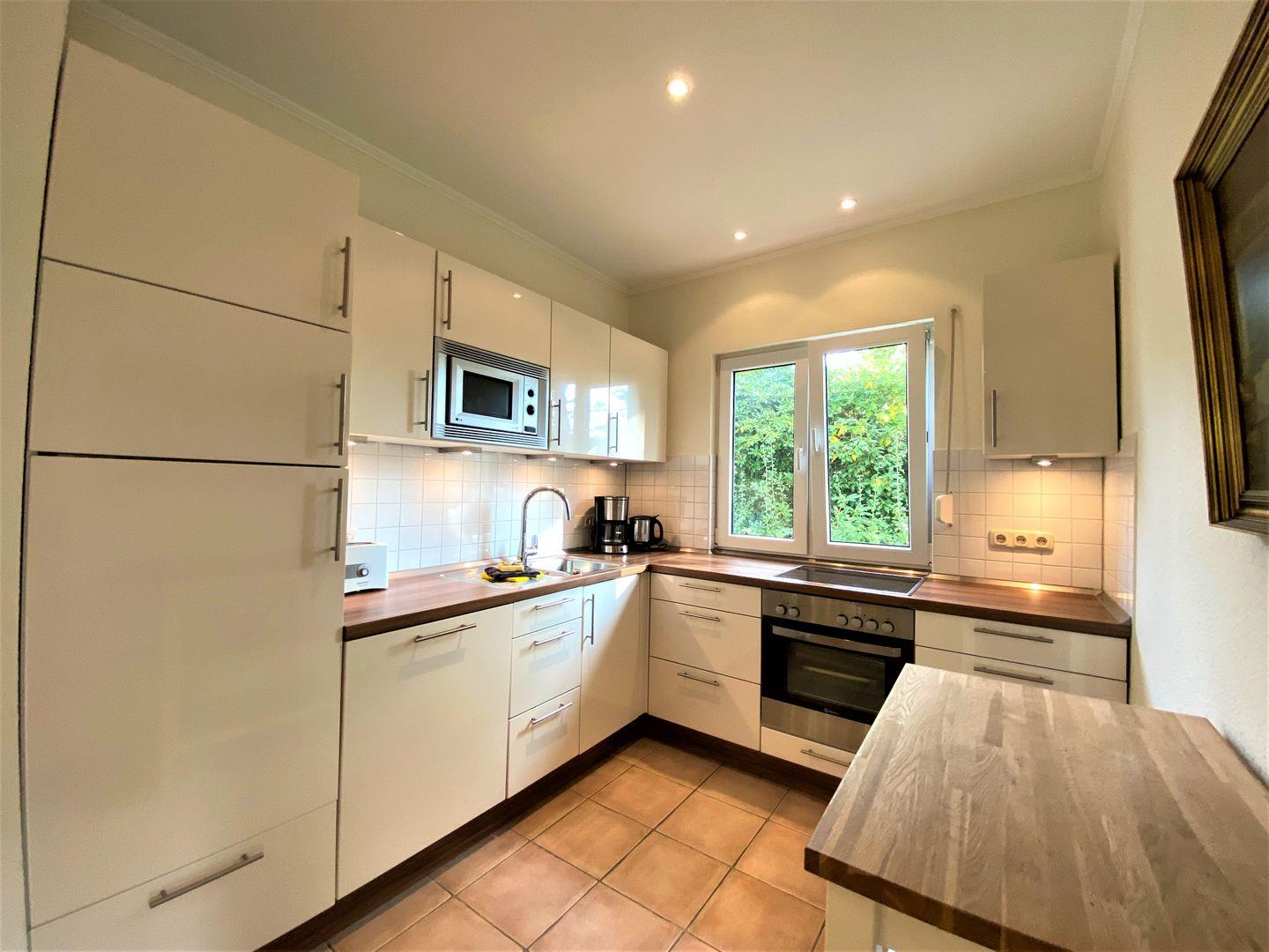 4-Zonen Cerankochfeld, Backofen, Dunstabzugshaube, Einbauküche, Gefrierfach, Geschirrspüler, Kaffeemaschine, Kühlschrank, Mikrowelle, Staubsauger, Toaster, Waschmaschine, Wasserkocher
