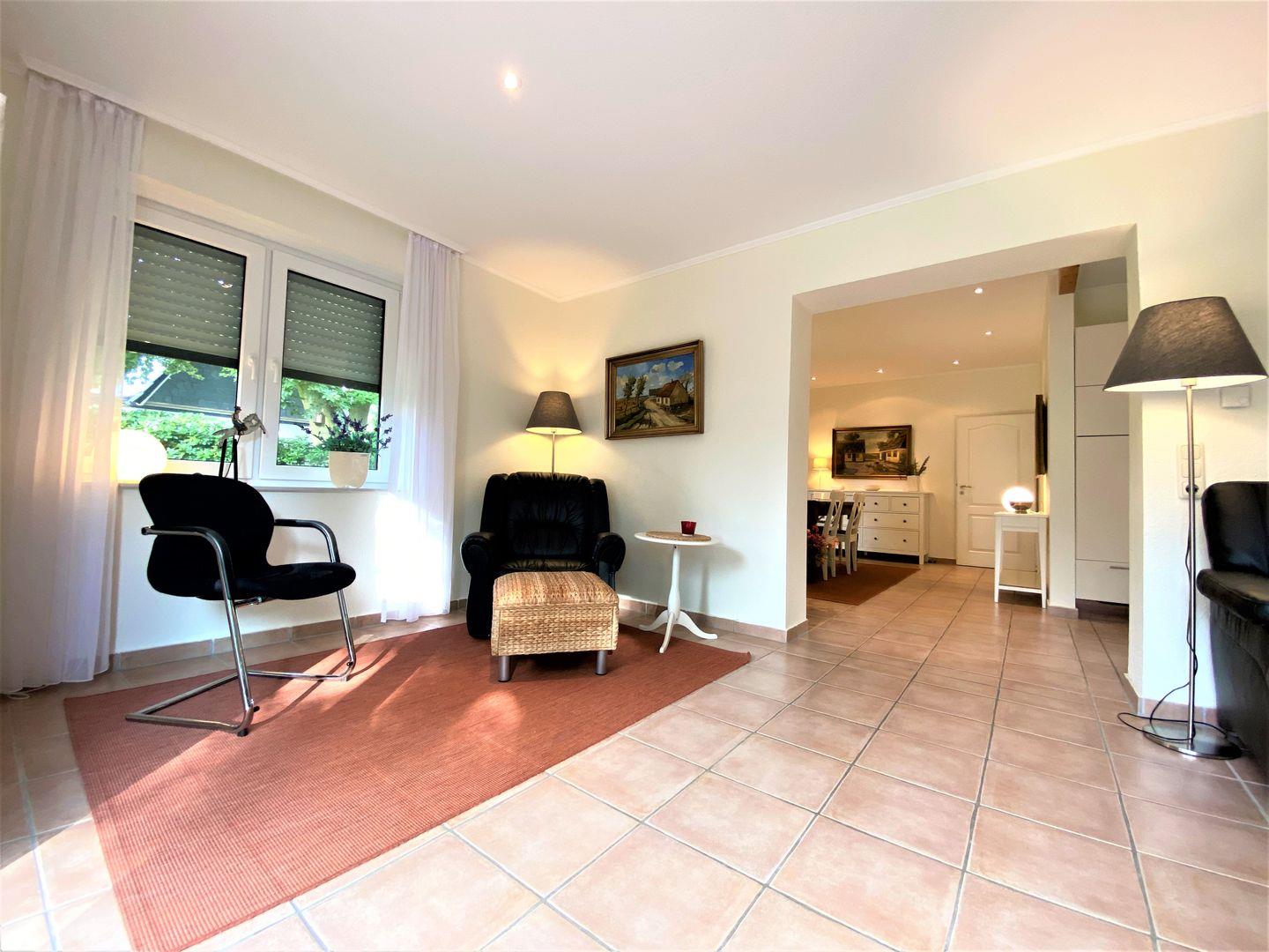 Im Haus erwartet Sie eine sehr geschmackvolle, angenehme Einrichtung. Helle luftige Räume, zwei Schlafzimmer, ein Gäste-WC, ein modernes Duschbad, ein großzügiger Essbereich mit angeschlossener moderner Einbauküche.