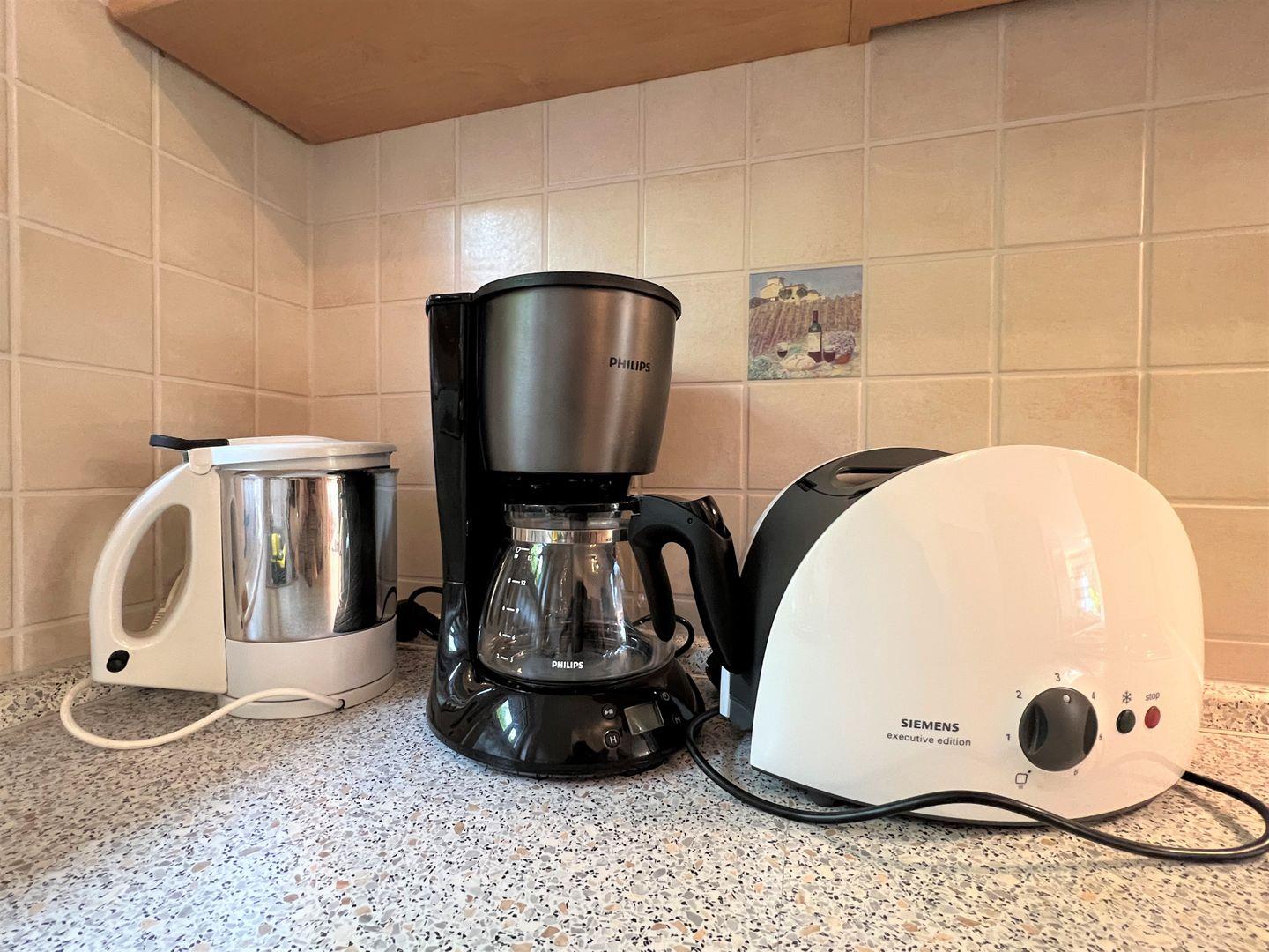 4-Plattenherd, Backofen, Dunstabzugshaube, Einbauküche, Gefrierfach, Geschirrspüler, Kaffeemaschine, Kühlschrank, Mikrowelle, Staubsauger, Toaster, Wasserkocher