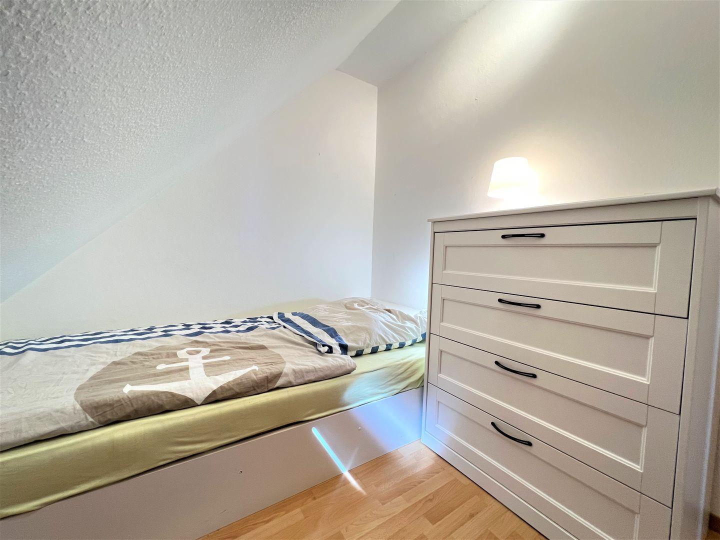 Im Obergeschoss erwarten Sie zwei Schlafzimmer: Das Elternschlafzimmer mit Ehebett und einem Einzelbett, sowie ein weiteres Zimmer mit einem Einzelbett. Die Treppe im Obergeschoss kann durch ein Treppengitter gesichert werden. Ein Duschbad mit WC und Waschmaschine runden das Angebot ab.