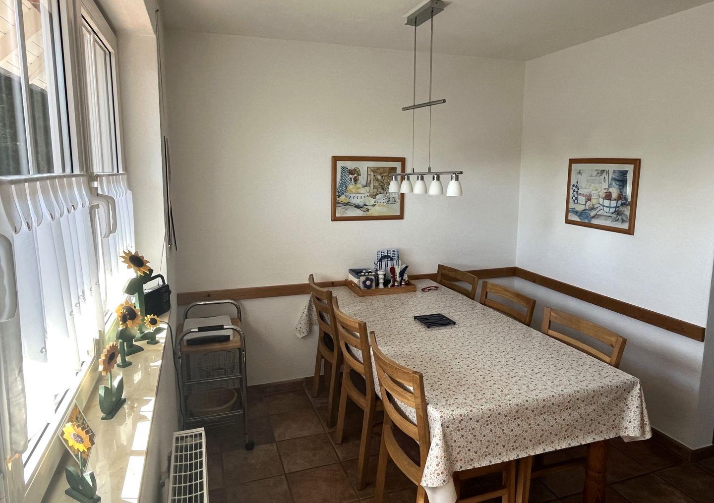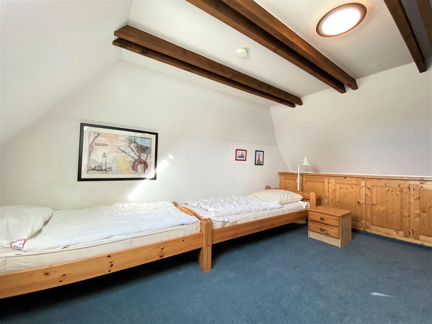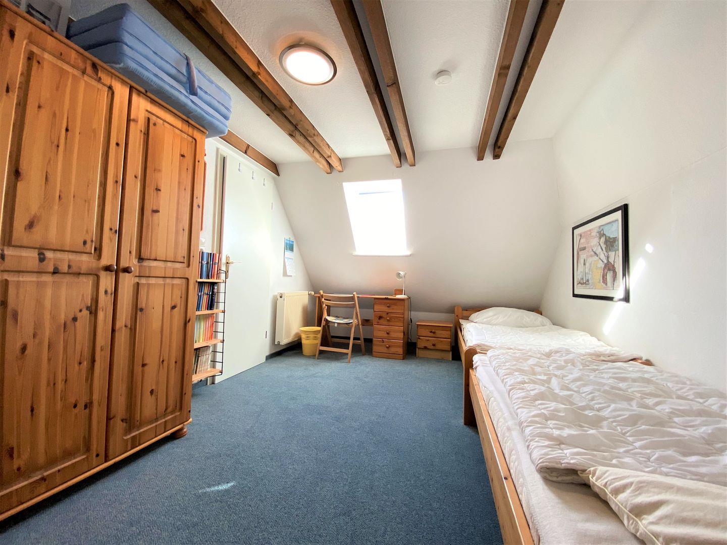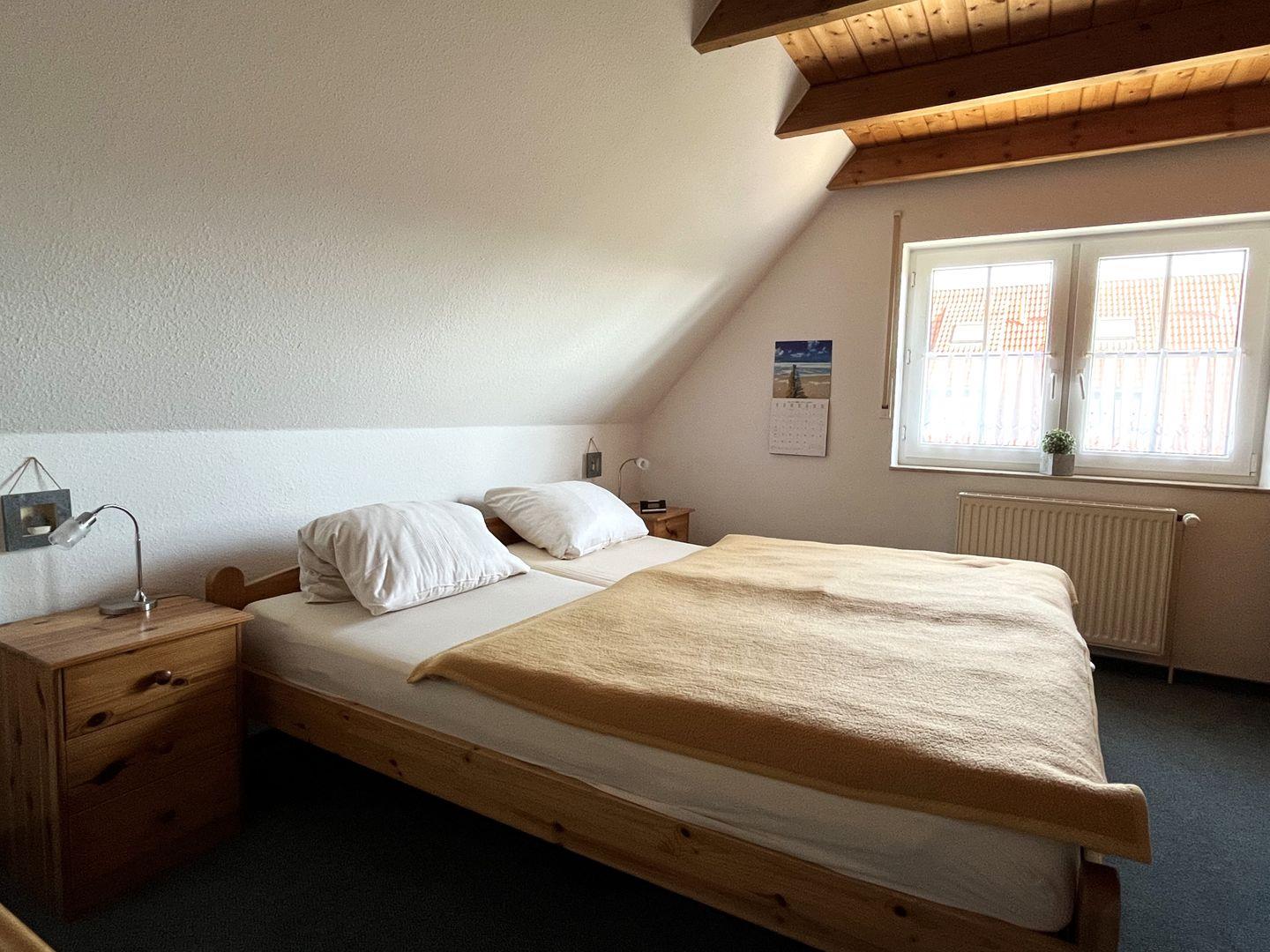Das Elternschlafzimmer mit Ehebett sowie ein weiteres Schlafzimmer mit zwei Einzelbetten stehen im Obergeschoss für Sie zur Verfügung. Das dritte Schlafzimmer mit zwei Einzelbetten befindet sich im ausgebauten Dachstudio.