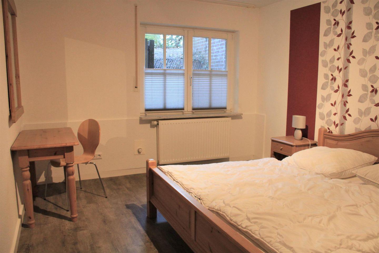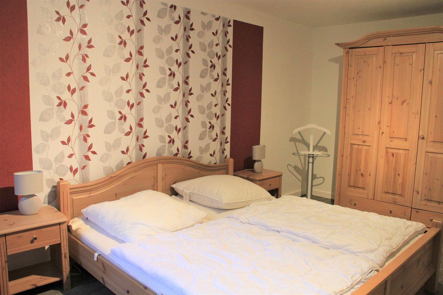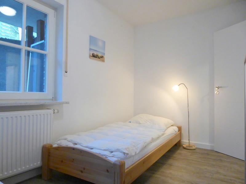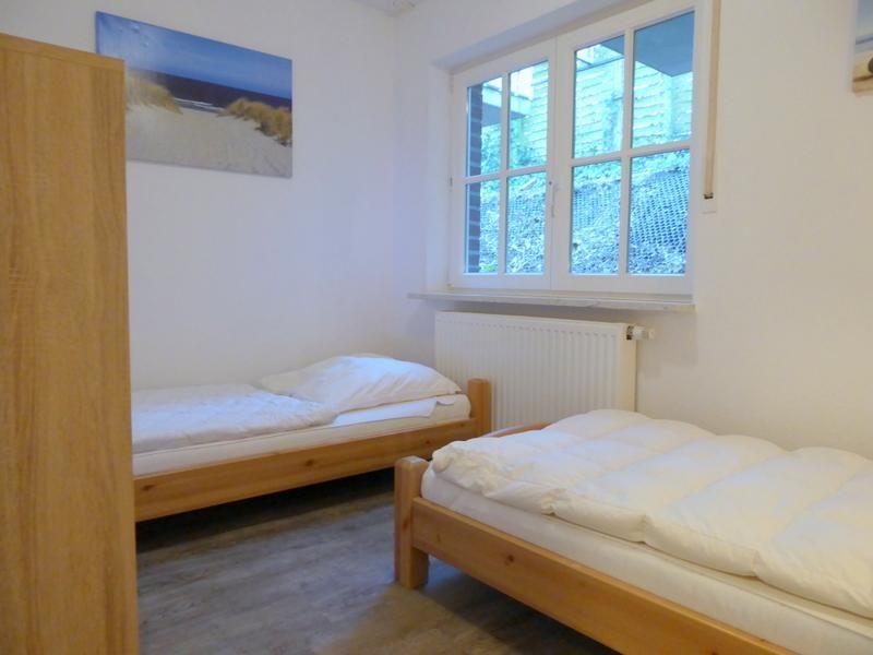 Über eine Treppe (mit Treppengitter oben) gelangen Sie in das Souterrain zu den zwei Schlafzimmern: Das Elternschlafzimmer mit Doppelbett sowie das Kinderschlafzimmer mit zwei Einzelbetten. Beide Schlafzimmer sind mit großen Kleiderschränken und angenehmer Fußbodenheizung ausgestattet. Auch diese Räume sind groß, hell und freundlich. Das große und komfortable Vollbad rundet das Angebot ab.