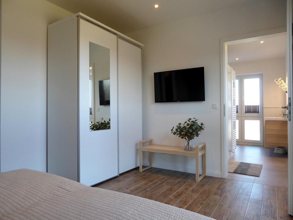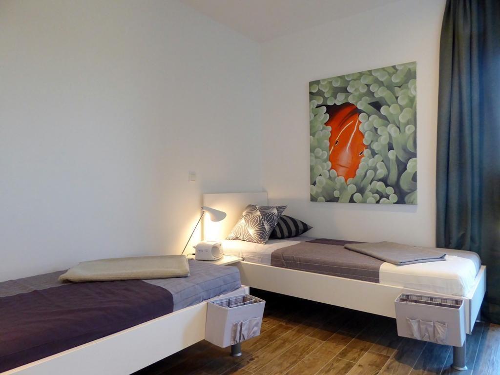 Schlafzimmer 1: gemütlich eingerichtetes Schlafzimmer mit Doppelbett (2 Einzelmatratzen), Flatscreen-TV, Leselampen, Kleiderschrank, Fußbodenheizung und beschichteten Plissées, ein Schlafzimmer mit Meerblick