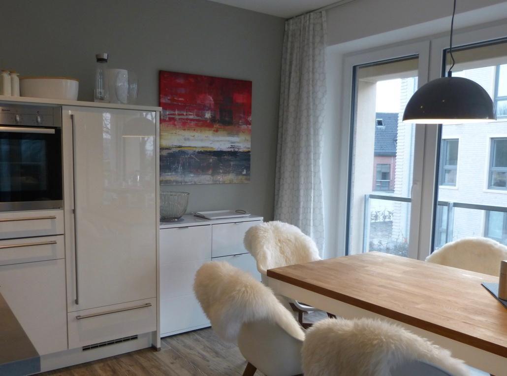 Sie gelangen über einen Fahrstuhl oder über die Treppe in Ihr Domizil. Durch den Flur mit geschickt integrierter Garderobe geht es in den liebevoll und sehr gemütlich eingerichteten Wohn- und Essbereich. Ob stilvoller Schaukelstuhl, das bequeme Sofa oder doch lieber die Leseecke mit Relaxsessel und Blick auf den Jadebusen - Sie haben die Wahl. Eins ist sicher - hier erleben Sie Erholung pur! Für die kühleren Tage oder die späteren Abendstunden erzeugt der Elektrokamin ein warmes Ambiente.