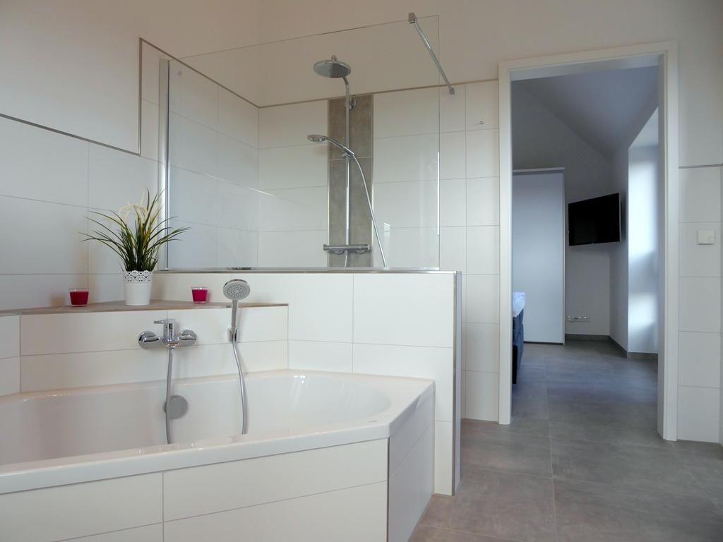 Vom Schlafzimmer geht es durch eine elegante Glasschiebetür in Ihr persönliches Traumbad: Die große, offene und begehbare Sommerregendusche oder doch lieber die Eckbadewanne? Sie haben die Wahl. Der Doppelwaschtisch mit beleuchtetem Spiegel, sowie ein WC vervollständigt das Angebot in diesem lichtdurchfluteten Badetraum.