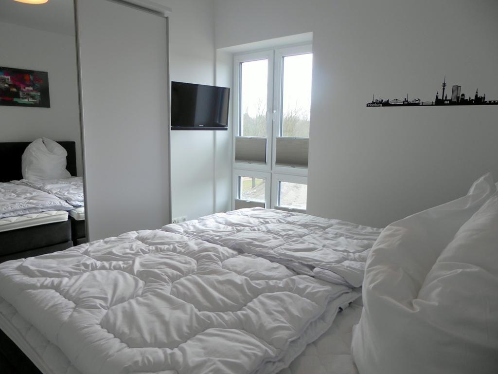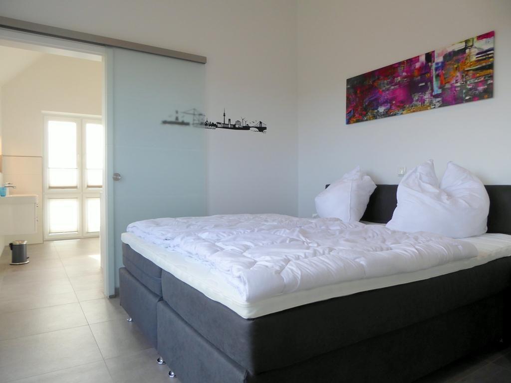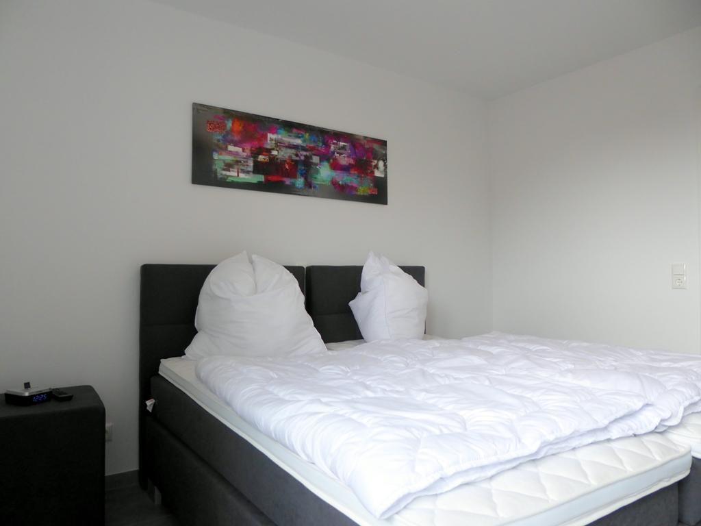 Über einen Fahrstuhl oder die Treppe gelangen Sie in Ihr Premiumdomizil. Gleich links gehalten befindet sich schon das erste Schlafzimmer mit großem Doppel-Boxspringbett in Komforthöhe plus großem Kleiderschrank mit Spiegeltür. Für Unterhaltung ist gesorgt: Ein Flat-TV an der Wand sowie iPod-Dockingstation mit Radioweckern an den Betten rundet das Entertainmentangebot ab. Die Fenster sind dank beschichteter Plissees schnell und einfach zu verdunkeln.