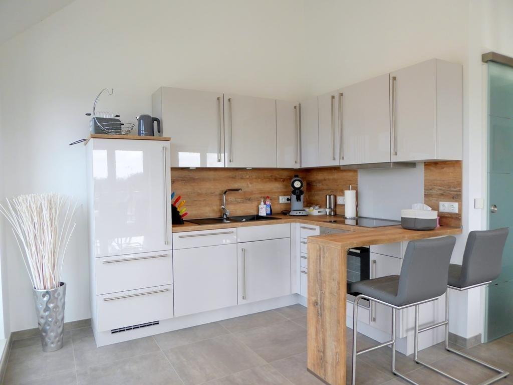 Kochbereich: moderner, offener, voll ausgestatteter Kochbereich mit Markengeräten (Kaffeevollautomat und Kaffeemaschine von Senseo, Geschirrspüler, Ceran-Kochfeld, Mikrowelle, Backofen, Dunstabzugshaube, Kühlschrank mit Gefrierfach, Wasserkocher, Toaster)