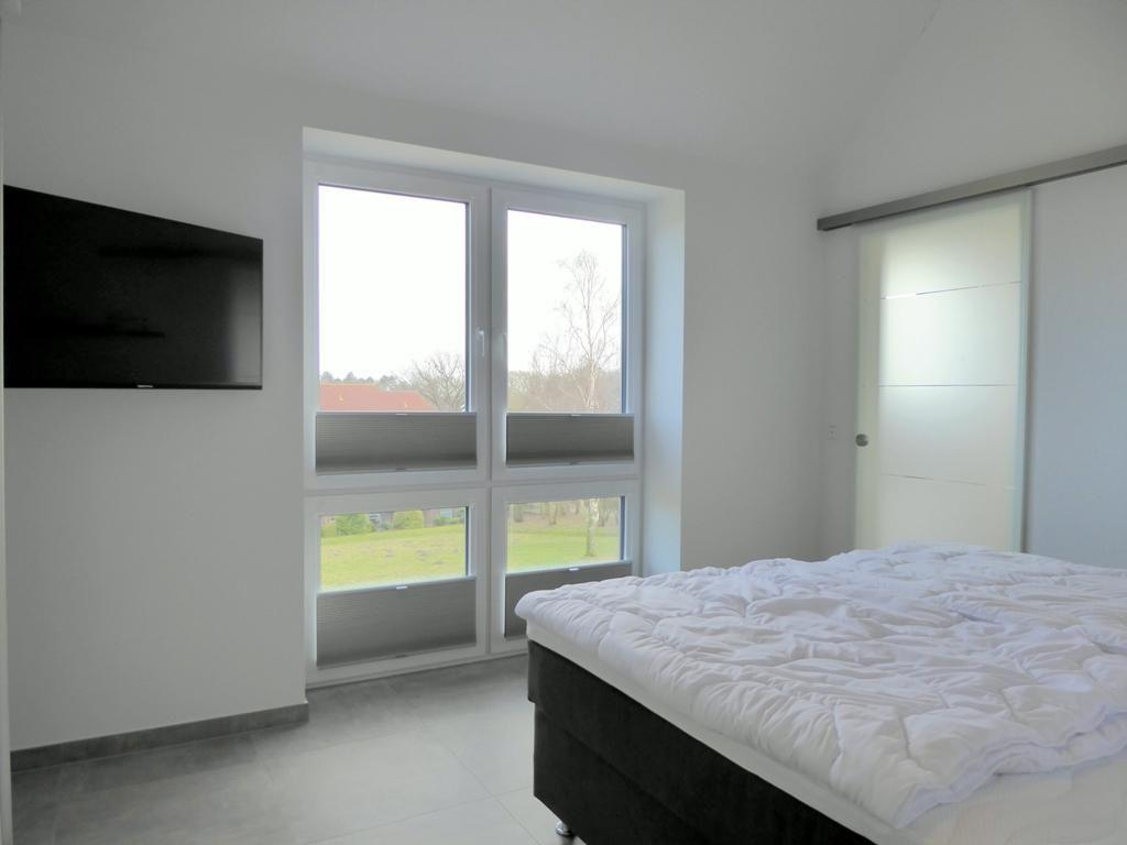 Das zweite Schlafzimmer überzeugt mit derselben Ausstattung wie das erste Schlafzimmer: Doppel-Boxspringbett mit Dockingstation, Flat-TV, Kleiderschrank mit Spiegeltür sowie Fenster mit Plissees.