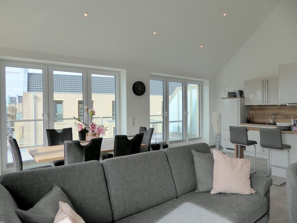 Von den schönen Schlaf-und Badräumlichkeiten geht es über zum Highlight: Der große, hell-freundliche Wohn-Essbereich mit Zugang zur durchgehenden Süd-West-Dachterrasse mit seitlichem Meeresblick. Bitte beachten Sie, dass der Zugang zum Balkon nur über eine innenliegende Stufe zugänglich ist.