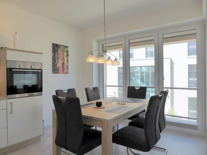 Die offene und moderne Küche ist mit den besten und neuesten Markengeräten ausgestattet. Der lichtdurchflutete Essbereich mit schönem Esstisch aus Holz und Schwingstühlen bietet eine sonnig-freundliche Atmosphäre.