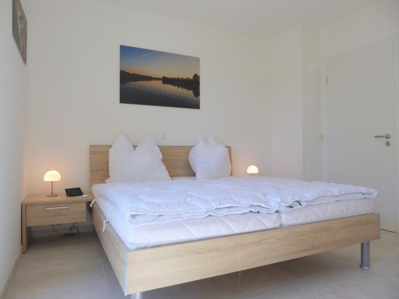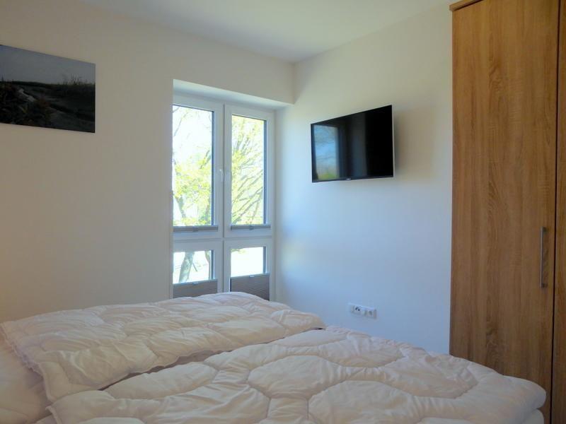 Zurück in den Flur geht es geradeaus in das zweite Schlafzimmer mit Doppelbett, großem Kleiderschrank und Flat-TV für beste Unterhaltung. Nebenan befindet sich das zweite, komfortable Duschbad mit WC.