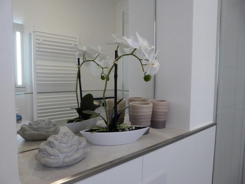 Auch dieses Bad bietet zusätzlichen Komfort dank raffinierter Nischen, Handtuchheizung und großem Spiegel plus Kosmetikspiegel.